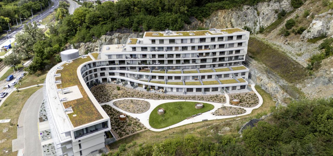 Zásadní roli hraje také práce se zelení. Zelené střechy a vegetační plochy nejsou pouhým doplňkem, ale plnohodnotnou součástí architektonického konceptu. Pomáhají změkčit objem stavby, zlepšují mikroklima a navazují na přírodní charakter místa, které bylo po desetiletí formováno těžbou.