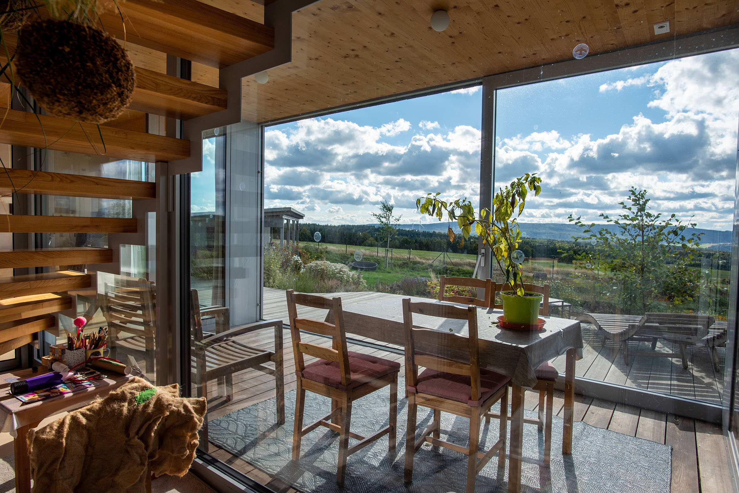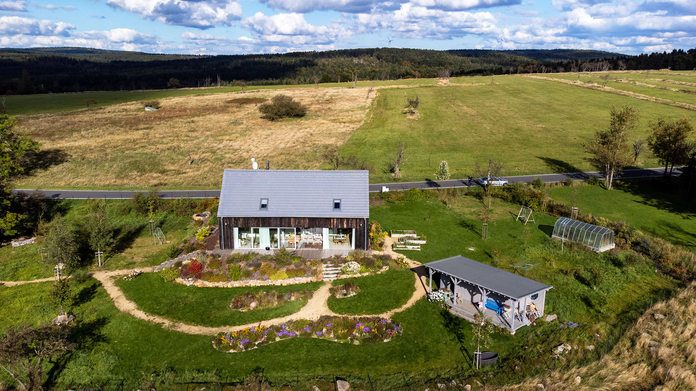 Idylické atmosféře domu na Větrném vrchu nic nechybí. Ačkoliv je to stavba moderní a poskytuje svým uživatelům veškerý komfort, v krajině působí naprosto přirozeným dojmem. Technika a architektura, cit pro místo a vtipně řešené detaily se spojily v jeden smysluplný celek.