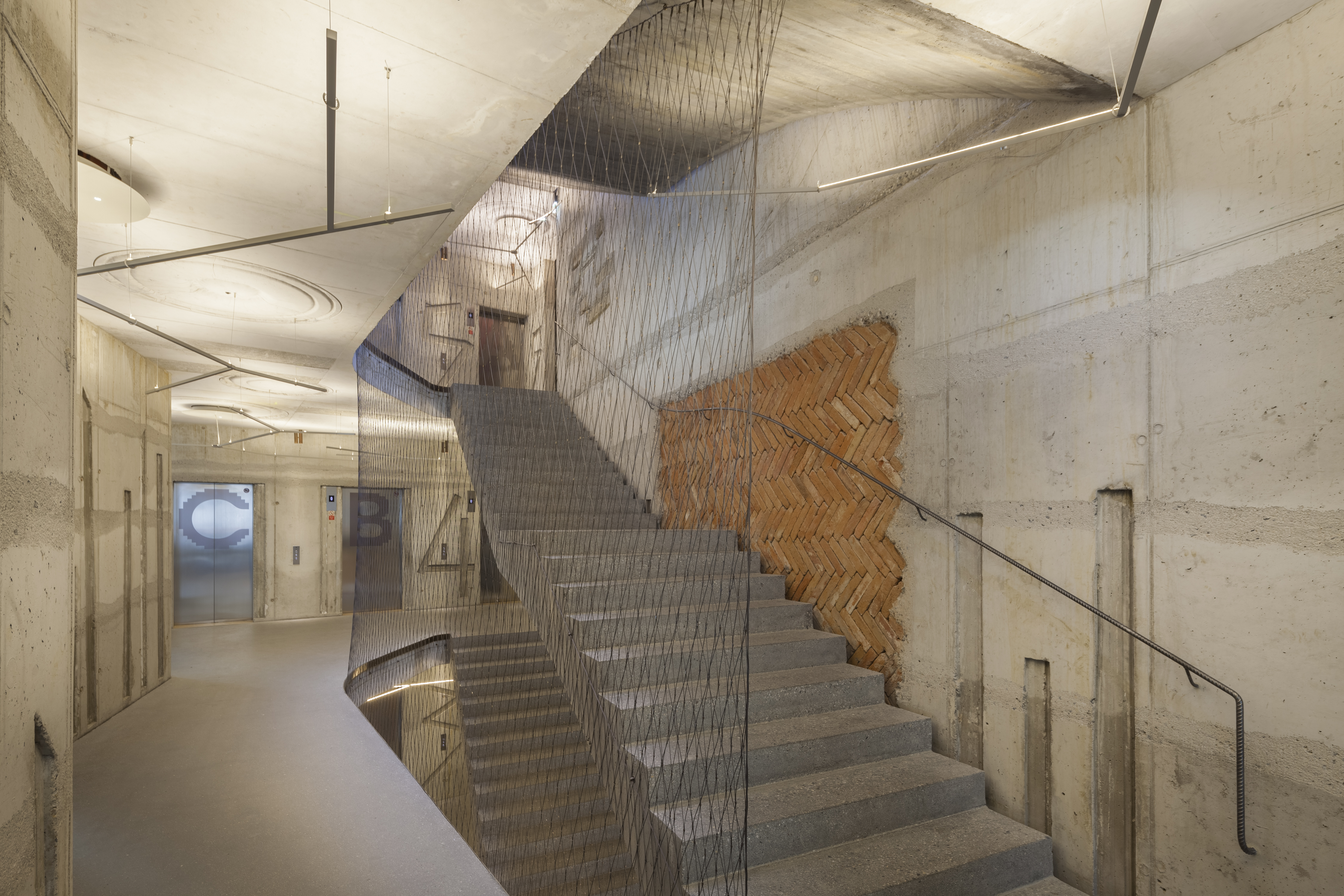 Důležitou roli hrají v DRNu barvy. Ve vstupní hale jsou napří klad barevně odlišeny jednotlivé vrstvy betonu, což na první pohled vyvolává představu na sebe navazujících geologic kých vrstev. Nevzniklo to ale samoúčelně. Na jednu stranu se jedná o vyjádření fi lozofi ckého obsahu řešení, protože po ukazuje na odhalování a přidávání vrstev ve vývoji domu na historické parcele. Na druhou stranu ale odkazuje i k samotné technologii, protože betonová konstrukce musela být realizována po vrstvách, aby se eli minovalo riziko zásahu do statiky sou sedního paláce Dunaj, k jehož štítové stěně DRN přilehl. Najdeme tu i další barvy. „Zamýšleli jsme se, jak beto nové konstrukce něčím odlišit od klasického technicist ního šedého betonu, beton jsme přibarvovali, vkládali do bednění různé prvky a vytvářeli tak zajímavé struktury,“ říká Jiří Václavů. „U vřetenového schodiště jsme použili be ton s černou pigmentací, v posledním patře dostal před nost pocitově odlehčující, ušlechtilý bílý beton, vyrobený z bílého cementu, částečně byl použit i modrý pigment, jenž má korespondovat s oblohou.“ U mnohých staveb strohá betonová hmota působí studeně, ale v případě DRNu tomu tak rozhodně není. Díky invenci a citu pro detail archi tekta Fialy zde byl vytvo řen zajímavý svět, který nenudí a působí hravě. Velkou roli v něm hrají také živé rostliny, ze jména na fasádě domu, která se díky nim přiro zeně proměňuje v prů běhu ročních období. V jednotlivých patrech nechal architekt zasa dit tisíce tulipánů, kte ré v době květu vytvoří efektní českou trikoloru, po jejich odkvětu je na hradí vysoké traviny. Na fasádě domu poutá po zornost také neobvyk lá, organicky tvarovaná mříž sestávající z měkce zohýbaných nerezových prutů vytvářejících jem ně měňavou, pohledo vě prostupnou plochu, která propojuje římsu Schönkirchovského paláce s římsou Paláce Dunaj. Podařilo se tak hravě spojit dvě odlišné úrovně obou domů výtvarně zajímavým prvkem, který ale současně koresponduje s materiálovým řešením obvykle používaným na Starém Městě a navíc tvoří ochranné zábradlí lodžií. Hra vost tvůrců a výtvarníků, kteří se na projektu DRN podíleli, se plně projevila i na takovém místě, jakým jsou garáže. Hned vjezd je celý pojednán jako trojrozměrný obraz, černé stěny, strop i vjezdová rampa jsou posety zlatými konturami a na drozměrnými „tahy štětce“. Na tomto řešení Stanislav Fiala spolupracoval s českým mistrem monumentální malby Pa trikem Háblem. Ten se věnoval i dalším plochám v garážích. Zaujmou zde barevně odlišené vstupy v jednotlivých pat rech, parkovací stání vyznačená stopami pneumatik, lidské šlápoty vedoucí k výtahům či „nárazníky“ na stěně z automo bilových pneumatik... Na stěně v podzemí je také velká plo cha s plastickými otisky dlaní dělníků a jejich nástrojů, bez jejichž práce by dům nevznikl. Jako celek působí palác DRN kompaktním a neuvěřitelně kultivovaným dojmem, který bude díky technickým řešením pro odborníky zajímavou inspirací a pro laiky krásnou zastávkou v novodobé historii Prahy.
