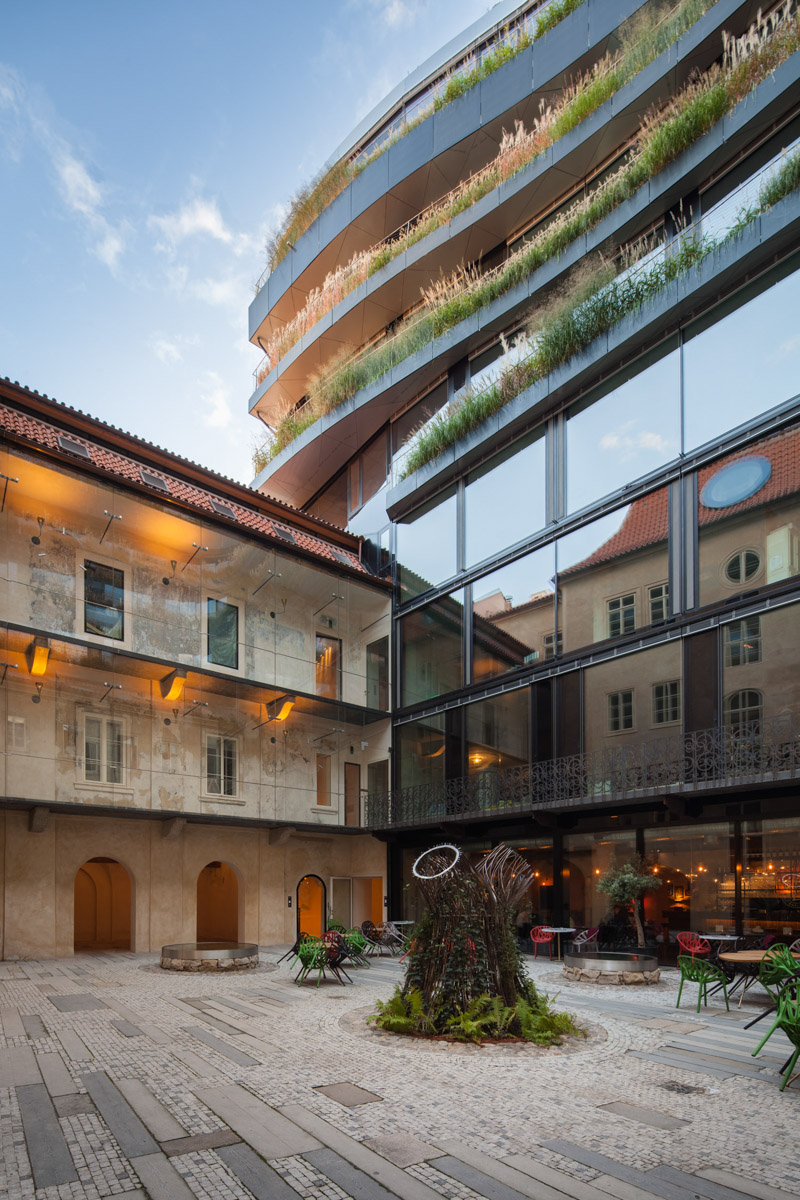 Když v roce 2012 Petr Němec koupil Schönkirchovský pa lác, získal spolu s ním projekt na hotel. Od samého začátku však věděl, že jej stavět nebude. Oslovil svého dlouholetého spolupracovníka architekta Stanislava Fialu a jeho tým v čele s technickým projektantem Jiřím Václavů, kteří stáli před ne lehkým úkolem. Museli začít podle projektu stavět, ale sou časně vymýšlet nový záměr, který však nesměl uhnout od vydaného stavebního povolení. První stavební práce začaly na rekonstrukci Schönkirchovského paláce, na niž navázala konstrukce základů nového objektu, což byl jeden z mnoha technických rébusů, protože původní plán počítal s různými gastroprovozy a kongresovým sálem, ale investor požadoval pouze podzemní garáže. Šlo tedy o zcela odlišné technické řešení, vezmemeli navíc v úvahu, že v té době nebyl jasný fi nální projekt. Staticky zabezpečit složitou rekonstrukci staré ho paláce a současně novostavbu bylo velmi komplikované a s odstupem času to budí zasloužený obdiv. Spodní stavbu nyní tvoří čtyři podzemní podlaží usazená v tzv. hnědé vaně (vodostavební beton s bentonitovou vodotěsnou izolací). Nad touto konstrukcí byl postaven klasický betonový skelet s kulatými sloupy, instalačními a komunikačními jádry. V hor ních patrech se dnes nacházejí kanceláře, střecha slouží jako terasa. Řada detailů a konstrukčních řešení byla realizována netradičně a mnoho nápadů vznikalo za pochodu. V této souvislosti často skloňovaný pohledový beton zde získal zcela jiný rozměr, protože byl zpra cován mimořádně invenčně. Například jsou v každém pat ře použity jiné povrchy strop ních desek, což jednoduchým způsobem rozbíjí obvykle šedou uniformitu. Architekt Stanislav Fiala využil řady artefaktů staršího objektu, které ne chal zajímavým způsobem promluvit v novostavbě. Řeč je na příklad o do betonu vetknutých fragmentech starého zdiva, kamenných prvků i prejzové krytiny. Charakteristickým rysem domu je způsob propojování starého a nového, kdy Schön kirchovský palác organicky prorůstá do nového a obráceně. Ačkoliv nová budova působí jako vysoký dům, jeho zaoblené křivky vše zjemňují a celý komplex budov vytváří útulný do jem. Zapomenout nelze ani na samotnou citlivou rekonstruk ci barokního Schönkirchovského paláce, který byl zbaven všech nepatřičných zásahů, byly v něm zpřístupněny gotické sklepy, odkryty klenby i s cennými malbami a odhaleny dře věné trámové stropy, částečně malované. Ačkoliv je dům plně v soukromém vlastnictví, veřejnost může ocenit krásy Schön kirchovského paláce při návštěvě galerie Zdeňka Sklenáře, je jíž interiér zpracoval Josef Pleskot.