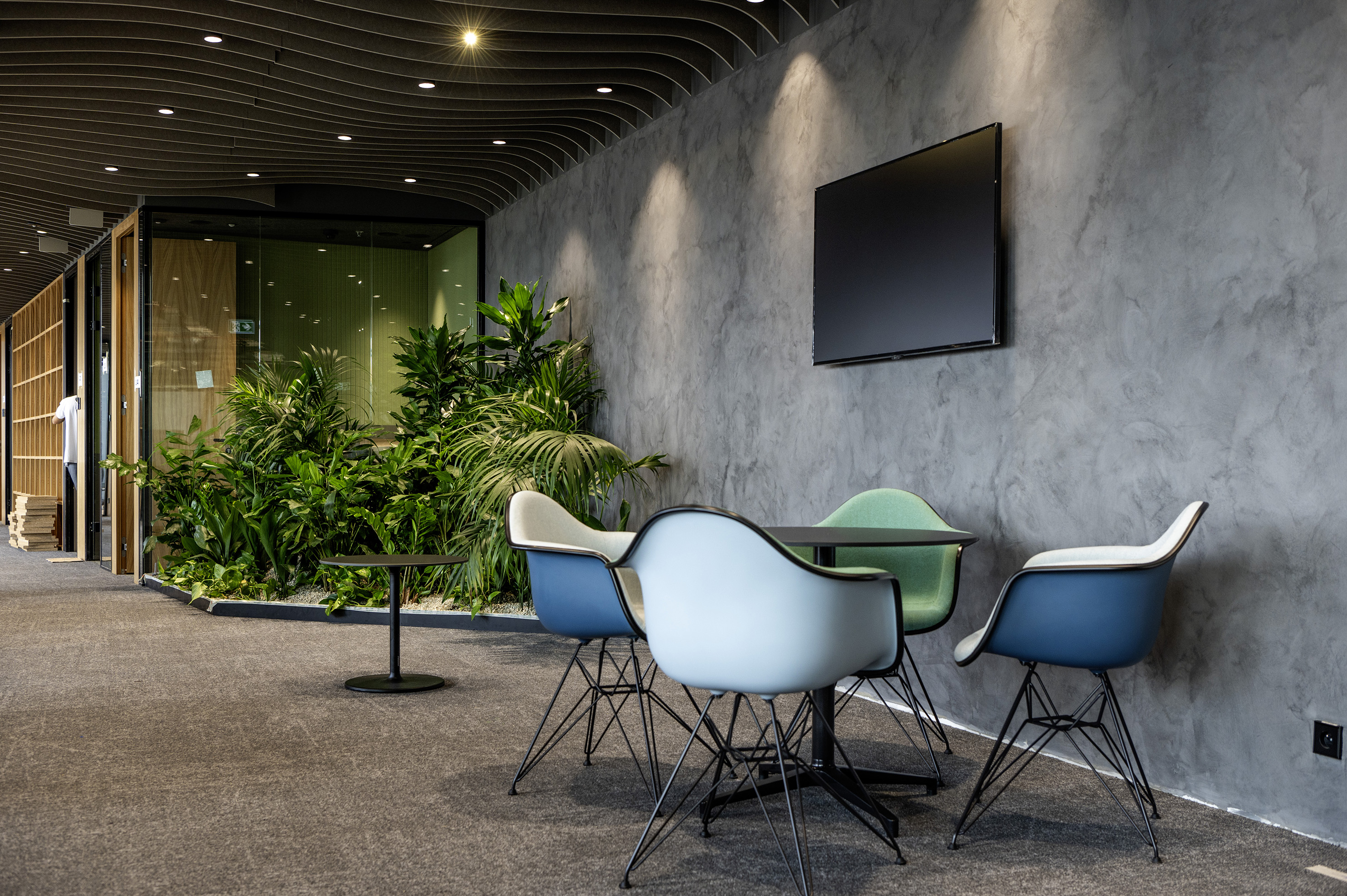 Konstrukční řešení obou budov je založeno na železobetonovém monolitickém sloupovém skeletu se systémem vnitřních komunikačních jader. Pro vstup do budovy jsou k dispozici dvě recepce jejichž design připomíná organické struktury, které jsou vyrobeny z větší části z Corianu (dodavatel AMOS DESIGN). Na konkávní a konvexní křivky navazuje Barrisol a také sádrokartonové konstrukce. V budovách je třicet lobby prostor, z nichž 26 je nadzemních. Podobně jako v řadě jiných administrativních budov, také zde jsou interiéry postaveny s pomocí suché výstavby, tentokráte se jednalo o systémy Knauf. Jedním z důležitých témat, kromě požární bezpečnosti, bylo řešení akustických vlastností pro kanceláře rozličných nájemců. Proto byly používány vesměs materiály s přidanou hodnotou. Ale nejen s akustikou, ale také s množstvím instalací se stavba při realizaci musela vypořádat.