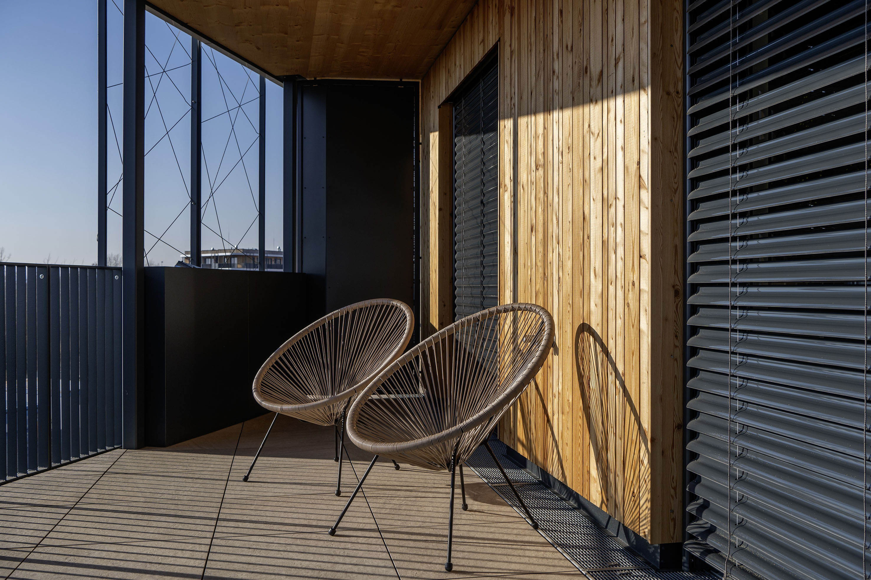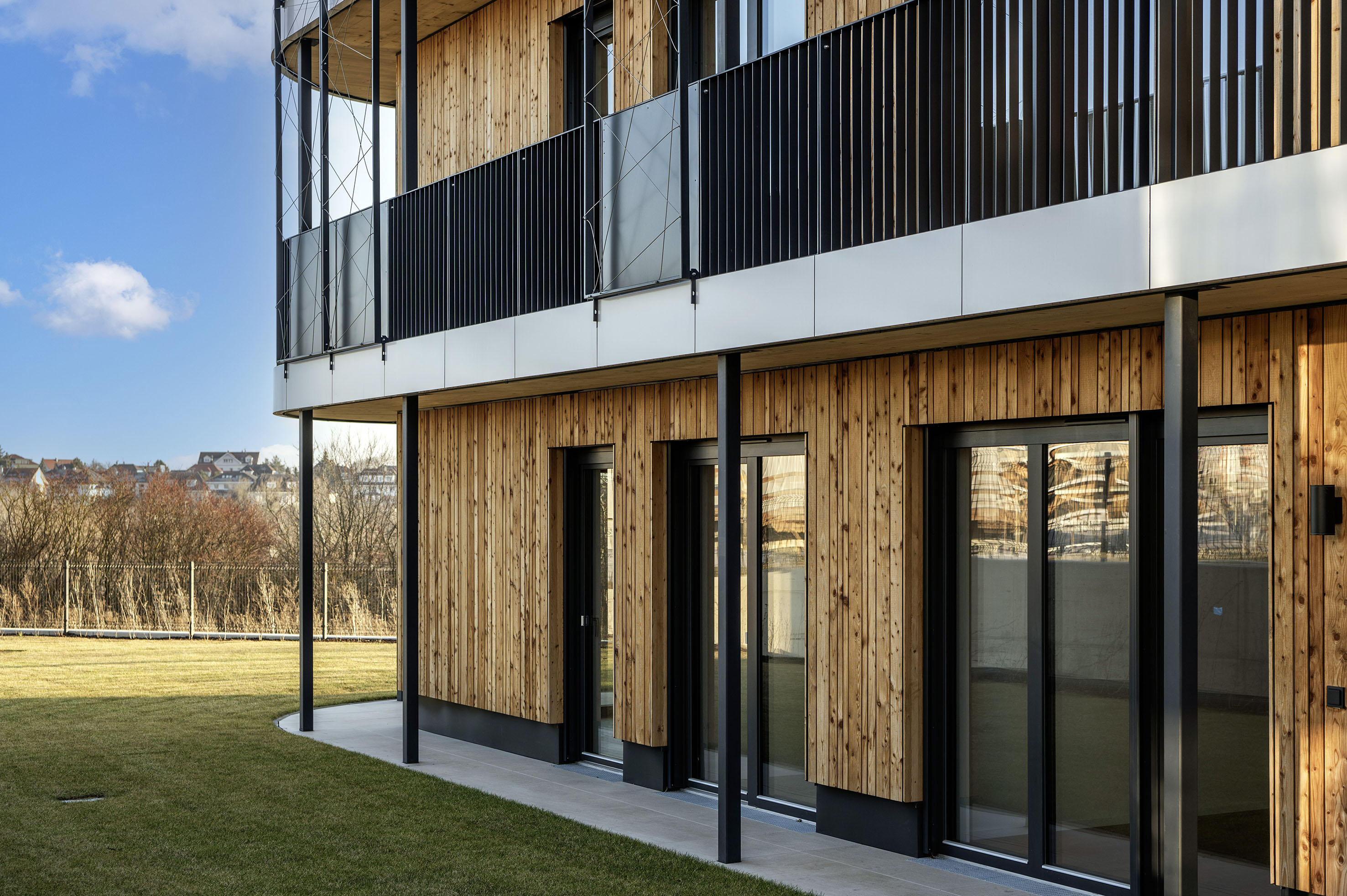 Stavební otvory vyplňují dřevěná okna s izolačním trojsklem (Uw=0,76 W/m2K). Na straně balkonů je navržena provětrávaná fasáda s modřínovým obkladem. Ostatní části fasády jsou zatepleny kontaktním zateplovacím systémem, v kterém byla použita minerální vata jako izolant.