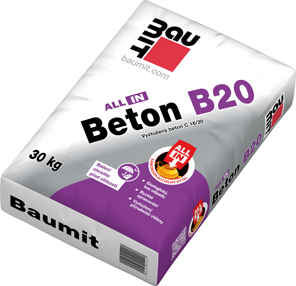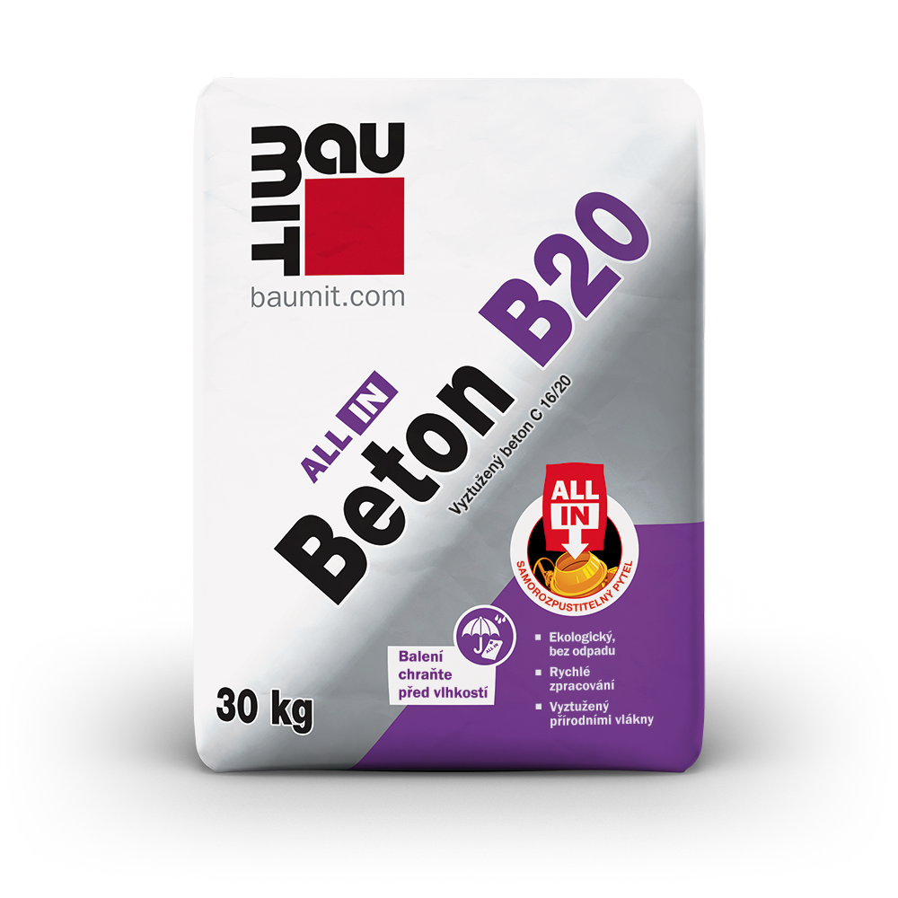 Beton Baumit All In B20 je klasický konstrukční beton s pevností v tlaku 20 MPa. Je tedy možné s ním vytvářet jak některé nosné konstrukce, tak třeba schodiště, základové patky apod. Bonusem navíc je již zmíněná vyšší pevnost v tahu za ohybu. Je možné jej připravovat jak v míchačce, tak i míchadlem. Aby byl beton připraven a pytel rozpuštěn, musí se dodržet předepsaná doba míchání. Pytel se zpracovává pochopitelně celý, ale pokud by někdo potřeboval jen půl pytle, nevadí, nicméně přichází o již zmíněné benefity. Beton B20 vyzrává tradičně po cca 28 dnech. Vzdušná vlhkost mu nevadí, ale pytle je nutné chránit před přímým stykem s deštěm apod.