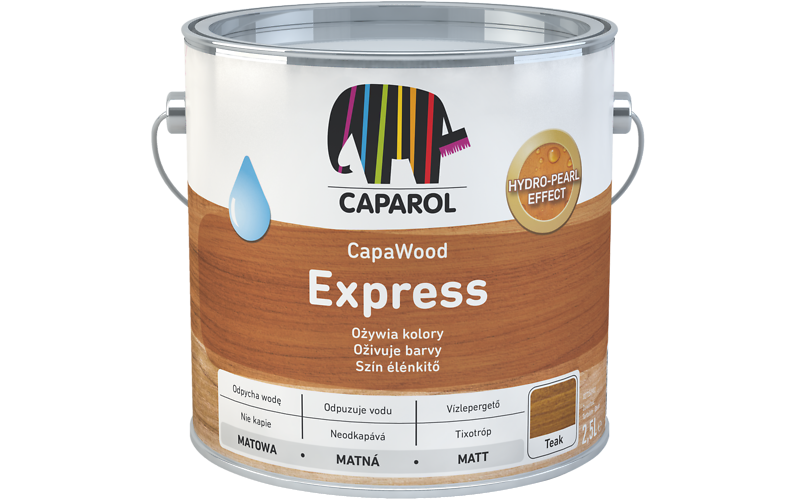 Ekologické, tenkovrstvé, vodou ředitelné lazury na dřevo CapaWood Express pro použití v interiéru i exteriéru. Odolávají vlivům povětrnosti, chrání dřevo před vlhkostí a jinými vlivy počasí. Jsou tixotropní, to znamená, že mají gelovou – nestékavou konzistenci, která usnadňuje a zrychluje aplikaci a omezuje tak vznik nepořádku při natírání. Lazury mají hedvábně matný vzhled a povrch s Hydropearl efektem®. Díky němu voda na povrchu vytváří malé kapičky a nevsakuje se do dřeva. Dřevo je tak ještě lépe chráněno před vlhkostí. Lazury zajišťují vysokou ochranu před UV zářením a dřevo tak nezašedne a odstíny lazur nevyblednou. Lazury jsou připravené ihned k použití, na výběr je 8 atraktivních odstínů. Jsou ideální pro nátěry dřevěných obkladů stěn a stropů, plotů, balkonových obkladů, prvků na dětských hřištích nebo dřevostaveb.