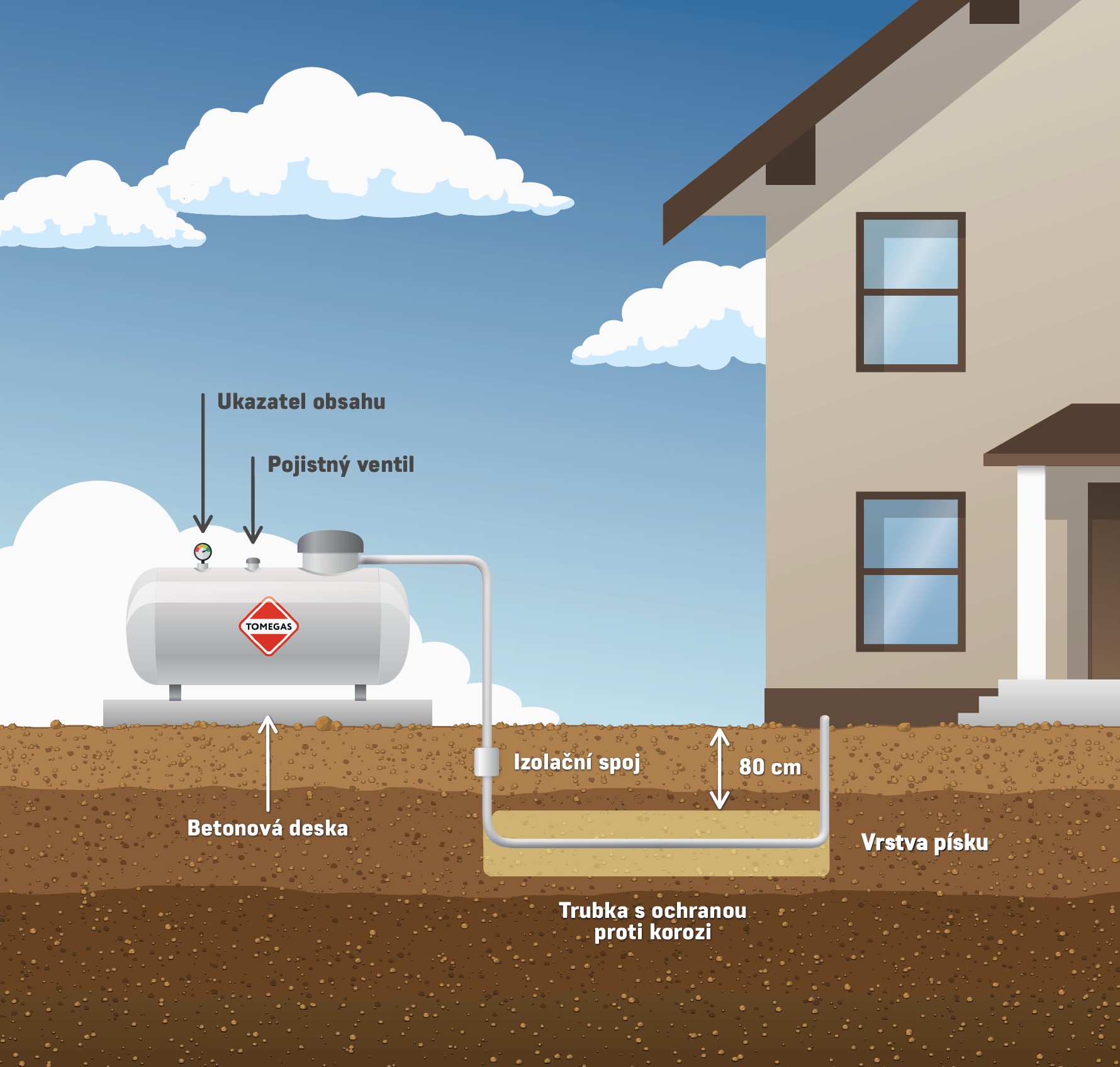 Jak již bylo zmíněno, kromě topné soustavy také zásobník plynu. Pro běžný rodinný dům stačí na jednu topnou sezónu objem 2,7 nebo 4 m3. To záleží na spotřebě, požadavcích a velikosti vytápěné užitné plochy. Zásobník lze umístit na zahradu, ale pokud by to někomu z estetického hlediska vadilo, tak jej lze zabudovat i pod zem. Jen zde přibydou náklady na zemní práce. Při instalaci je potřeba dodržet ochranné pásmo, které není nikterak velké. Zásobník nesmí do sklepa. Bezpečně můžete mimo pásmo třeba grilovat na otevřeném ohni apod. Užívání je proto zcela bezpečné. Za dodavatele plynu i zásobníku můžete zvolit například firmu TOMEGAS, která má za sebou více než dvacetileté zkušenosti a hlavně dodává kvalitní plyn, což se odráží v nízkých nákladech na vytápění. TOMEGAS vám rovněž na přání připraví projekt včetně veškeré dokumentace.
