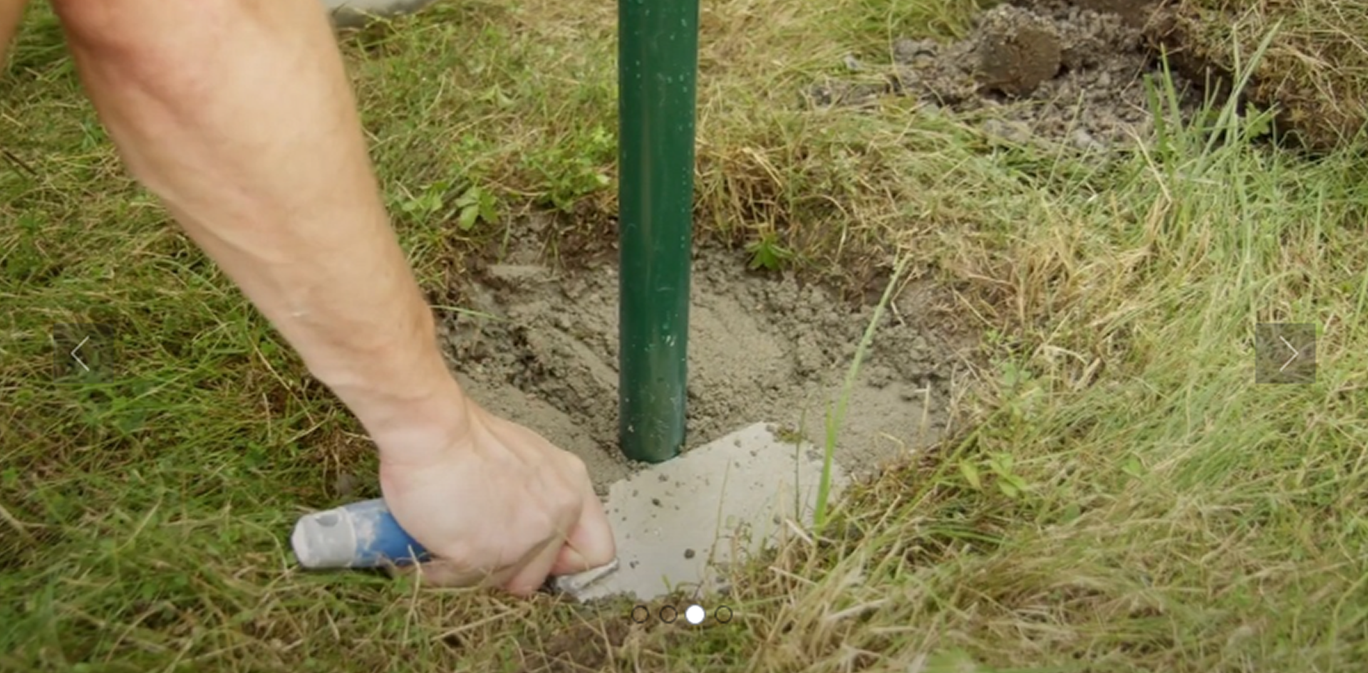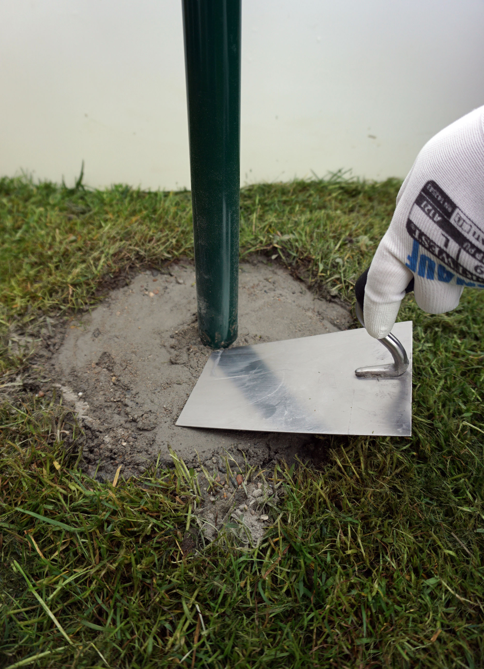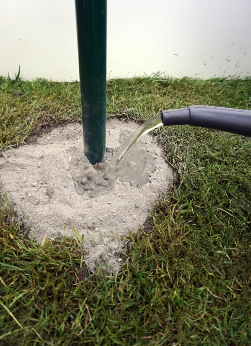 Bud si nejprve směs připravíme rozmícháním s vodou v externí nádobě, a to v poměru 25 kg betonové směsi a 2,5 litru vody. Pod sloupek do jámy naneseme několikacentimetrovou vrstvu takto připraveného betonu. Následně sloupek za pomocí vodováhy vložíme kolmo do jámy a prostor vyplníme betonem. Ještě než beton vytuhne vyhladíme povrch. Po pár minutách je hotovo. Zbývá místo zatravnit.
