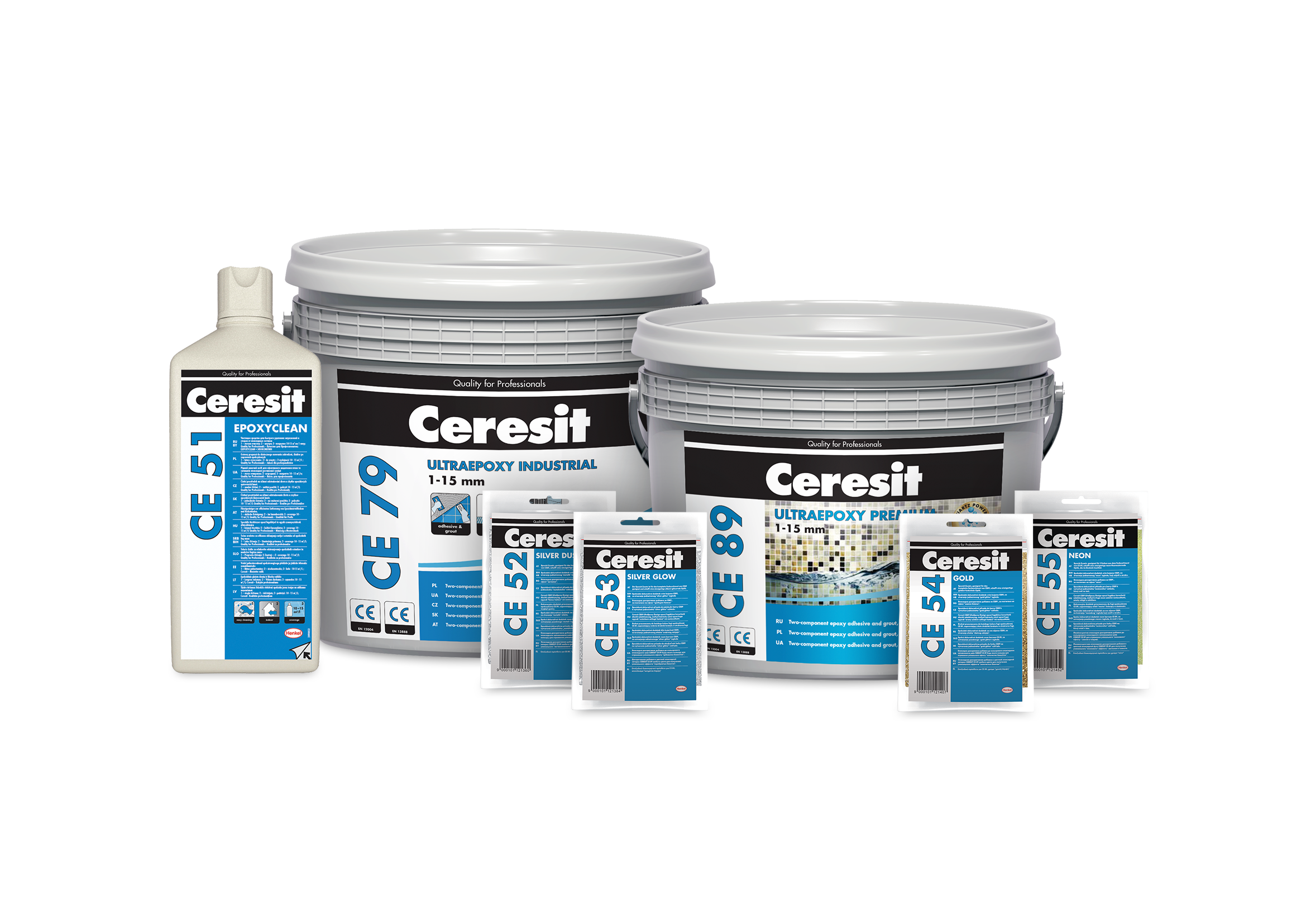Dvousložková chemicky a mechanicky odolná epoxidová spárovací hmota a lepidlo na obklady a dlažbu Ceresit CE 79 ULTRAEPOXY INDUSTRIAL má podobné vlastnosti, z hlediska lepených a spárovaných materiálů se hodí na přírodní kámen. Uplatnění nachází i díky schopnosti snášet extrémní zatížení ve veřejných a průmyslových oblastech. Tato spárovací hmota a lepidlo je dostupná v šesti barvách. Součástí sortimentu je CE 51 EpoxyClean, speciální čistič na odstranění skvrn, zbytků a znečištění od epoxidových spárovacích hmot ze všech typů keramických obkladů a přírodních kamenů.
