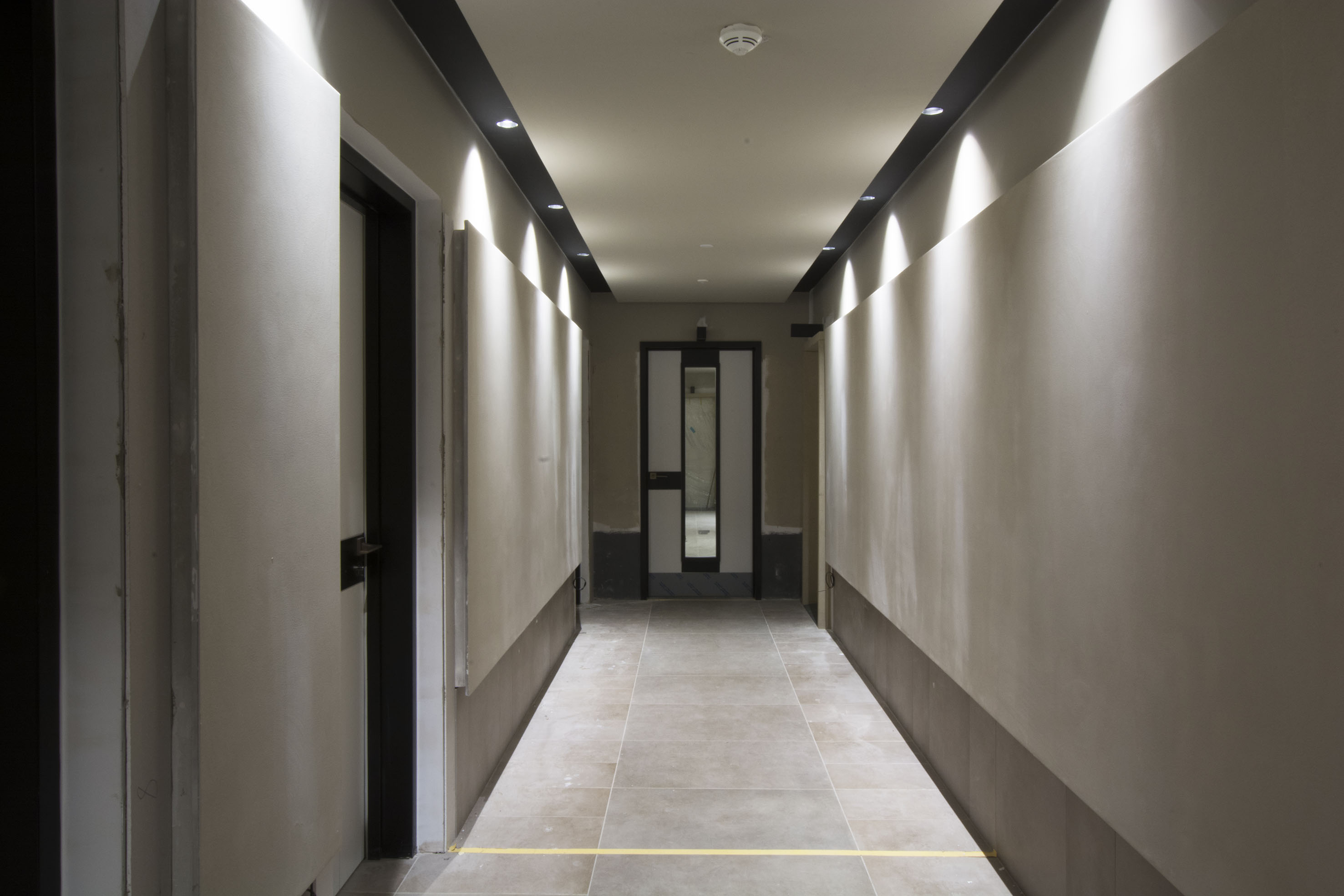 A pak je tu nejlepší kvalita povrchu hlazených sádrových omítek, která snese ta nejpřísnější kritéria. Plochy mohou být osvíceny z různých směrů a přesto by na nich neměla být znát sebemenší nerovnost nebo stínování. To je kvalita Q4, kterou lze dosáhnout jen v případě celoplošného přestěrkování kvalitními tmely v tloušťce do 2 mm. Povrch se navíc musí perfektně vyhladit a na sucho vybrousit jemným brusným papírem (min. zrnitost 180). Příkladem takového tmelu je Knauf ROLL & SPRAY MAX, Fill & Finish Light nebo Uniflott Finish. Kvalitu povrchu Q4 je zapotřebí předepsat a realizovat u tmavých stěn, které jsou například u administrativních budov populární. Ale nejen tam. Tmavé stěny jsou elegantní, ale velmi háklivé na viditelnost struktury povrchu. Viditelnost nerovností může ovlivnit rovněž finální barva. Z praxe to většina řemeslníků zná. Nátěr nic neschová ba právě naopak. Nejvíc problematické jsou také lesklé nátěry, které si opět vyžádají kvalitu Q4. Naopak matný nátěr je v tomto ohledu nejvíc benevolentní. Vyplatí se tedy řešit kvalitu povrchu předem se všemi okolnostmi, které ji mohou vizuálně ovlivnit – tj. zejména osvětlení a barva stěny.