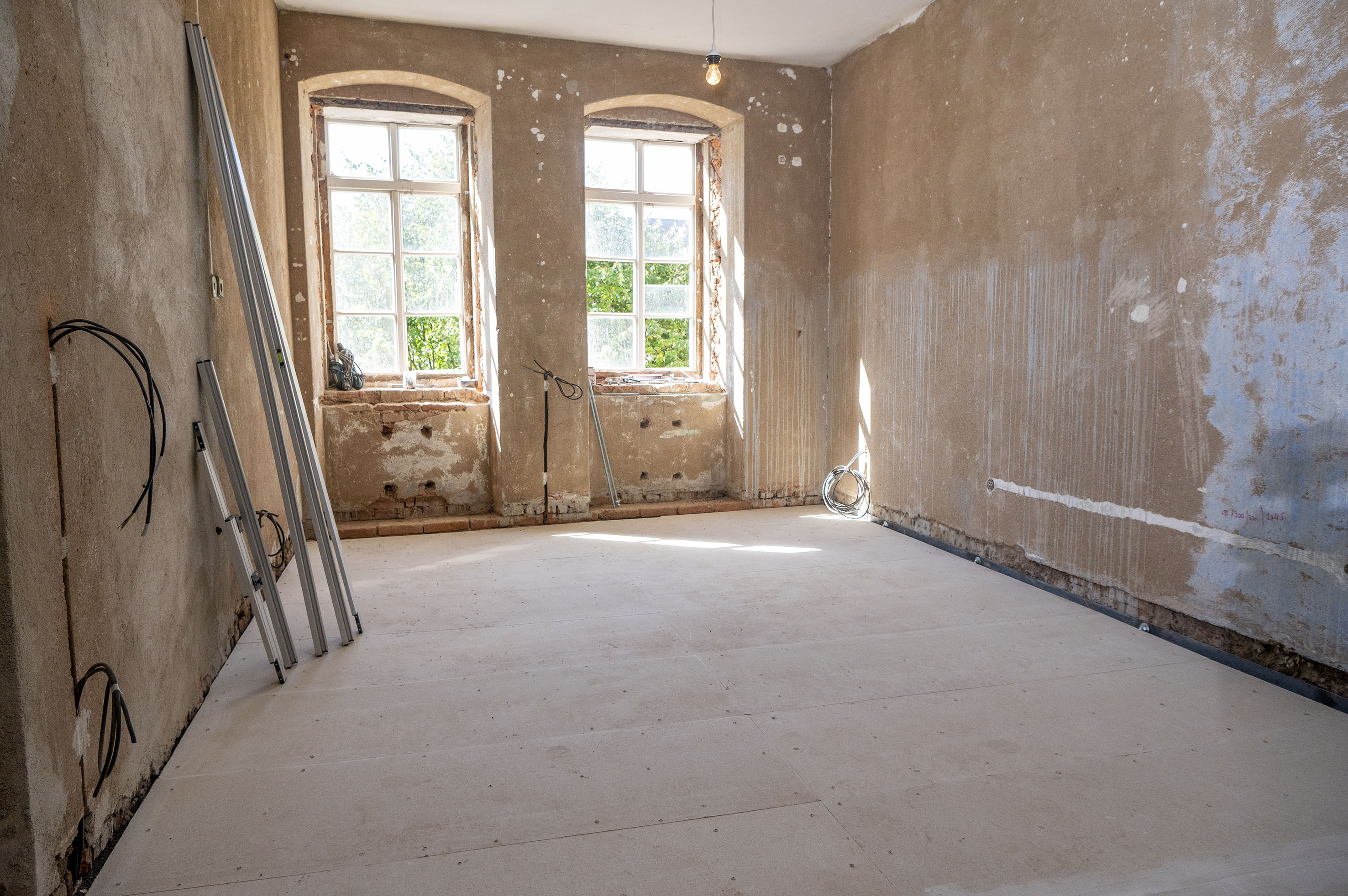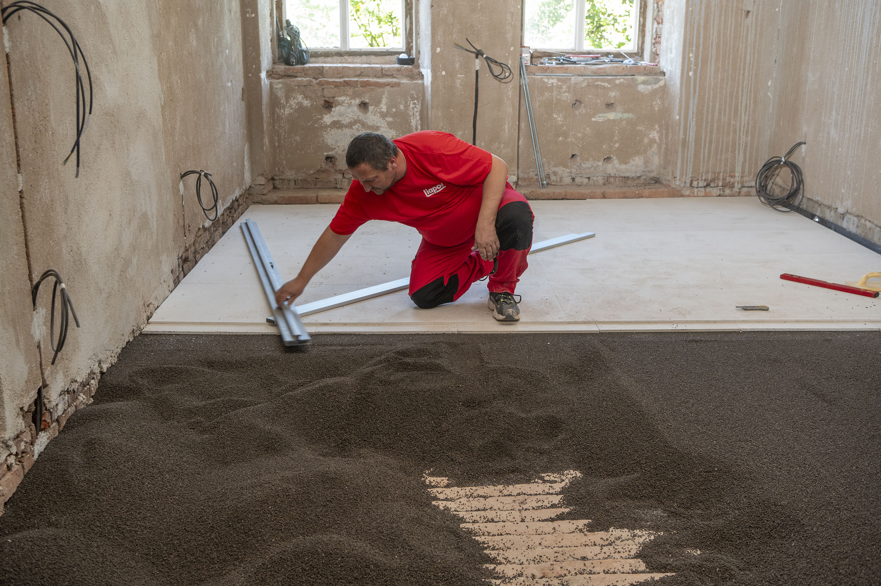 V prvním kroku se přistoupilo k odstranění starých vrstev původní podlahy a vyčištění plochy od hrubých nečistot. Ve většině místností prvního patra byla na odhalených klenbách realizovaná tzv. suchá plovoucí podlaha. Ta se skládá z několika vrstev. Její první vrstvu tvoří suchý vyrovnávací podsyp z Liaporu. Pro doplnění – Liapor (dříve keramzit) je lehké keramické kamenivo frakce 1–4 mm, které díky velikosti zrn snadno vyplní všechny dutiny. Přidanou hodnotou Liaporu jsou jeho tepelně-izolační vlastnosti a navíc funguje jako výborná akustická izolace. Na vyrovnaný podklad se realizuje další vrstva v pořadí, což jsou roznášecí sádrovláknité desky v doporučené minimální výšce 25 mm. Po jejich pokládce, prošroubování a vytmelení spár je možné položit finální nášlapnou vrstvu. Třeba vinylovou krytinu, dlažbu nebo také koberec apod. Jak sám název říká, jedná se o suchou podlahu, to znamená, že stávající konstrukci nezatížíme další vlhkostí, což má mimochodem také pozitivní vliv na dobu realizace. Je třeba se také zmínit, že do vrstvy Liaporu je možné „ukrýt“ různé instalace, ale pod podmínkou, že vždy dodržíme doporučenou minimální výšku vyrovnávacího podsypu, to znamená 20 mm. Optimální výška je 120 mm. Mohou však nastat situace, kdy potřebujeme ještě vyšší výšku vyrovnávacího podsypu. V tom případě můžeme vrstvu Liaporu rozdělit v polovině ztužující podlahovou deskou (stačí tl. 8 až 10 mm, celoplošně). Při realizaci podlahy se nesmí zapomenout instalovat po celém obvodu místnosti dilatační pásky, nejlépe z kamenné vlny. Pokud bychom to neudělali, měli bychom problém s možným přenosem kročejového hluku do okolních konstrukcí. Jedinou nevýhodou suché podlahy je, že není vhodná do vlhkých prostor.