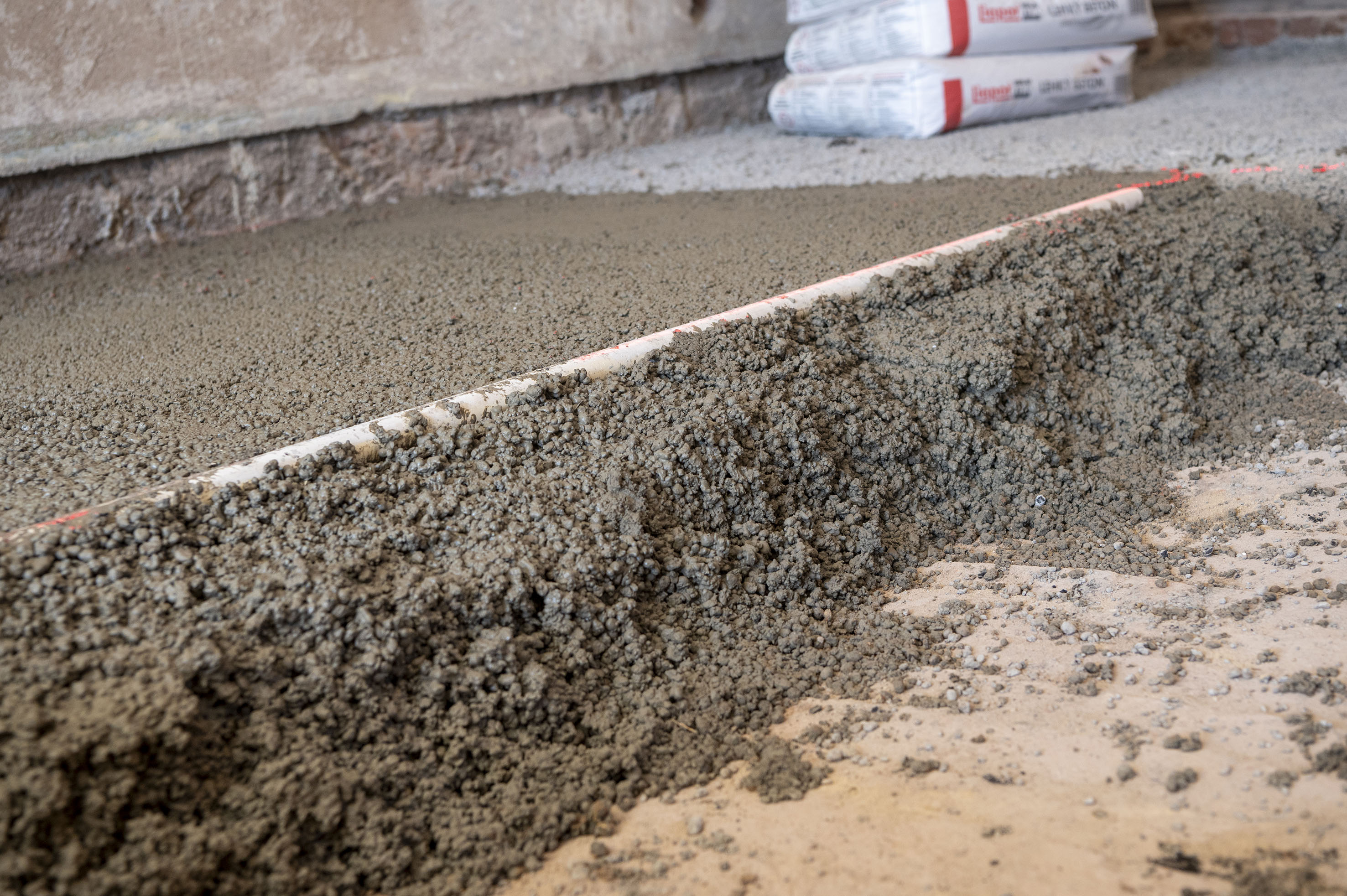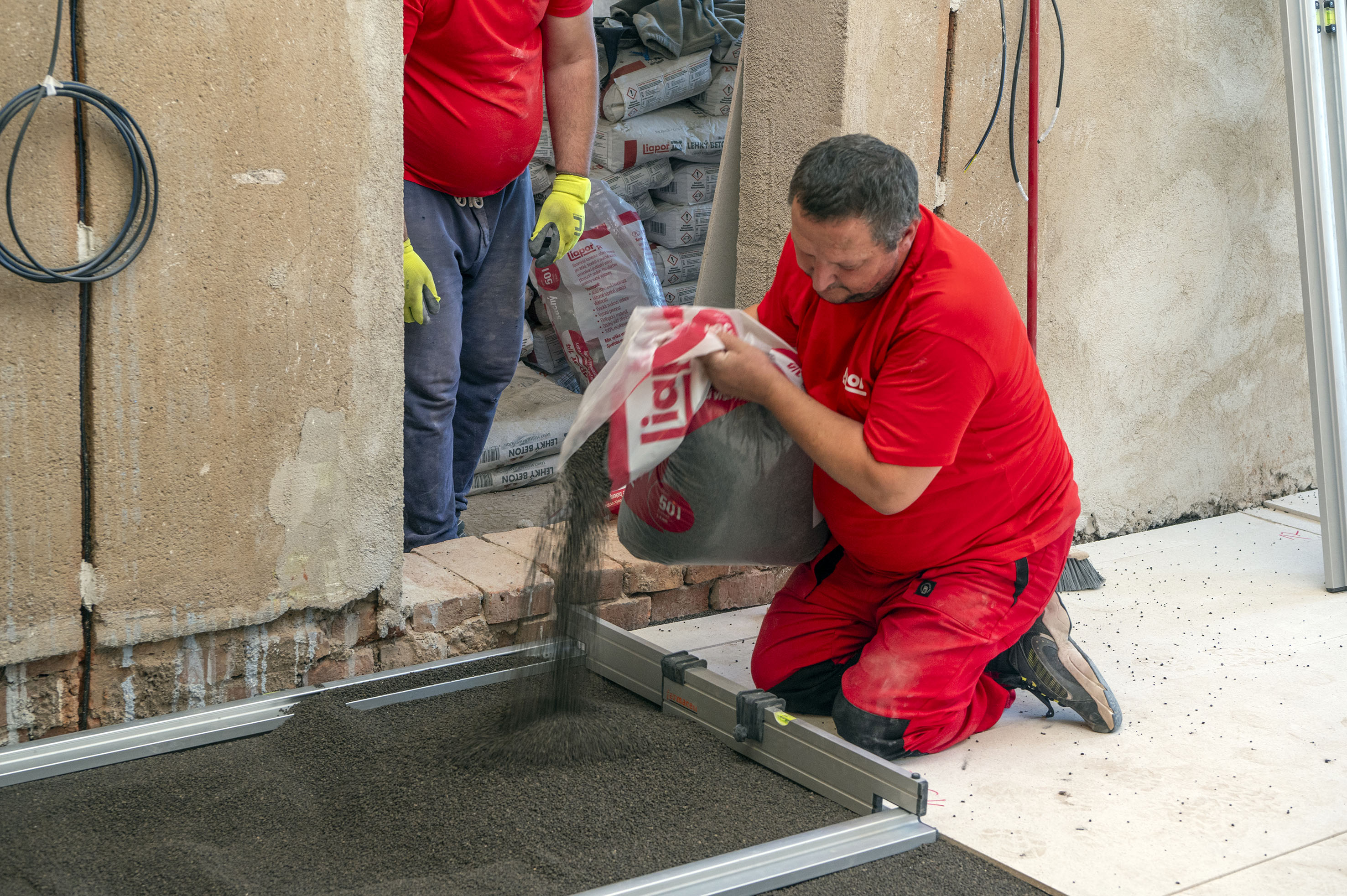 Jak jsme již naznačili, v místnosti s odhalenou klenbou, kde bude mít investor koupelnu, není suchá podlaha vhodná. Proto byla dána přednost lehkému betonu Liapor Mix. Jedná se o vstřícného pomocníka, který je ideální právě pro rekonstrukce v místech, kde nelze použít klasický beton – hlavně kvůli své nízké hmotnosti. V případě tohoto lehkého betonu je ve směsi klasické kamenivo nahrazeno kamenivem keramickým – Liaporem. Proto má Liapor Mix oproti běžným betonům výrazně menší (až třetinovou) objemovou hmotnost. Mezi jeho benefity patří tepelně-izolační vlastnosti, vysoká pevnost, trvanlivost, požární odolnost a také akustické vlastnosti. To vše se velmi dobře do historických objektů hodí.