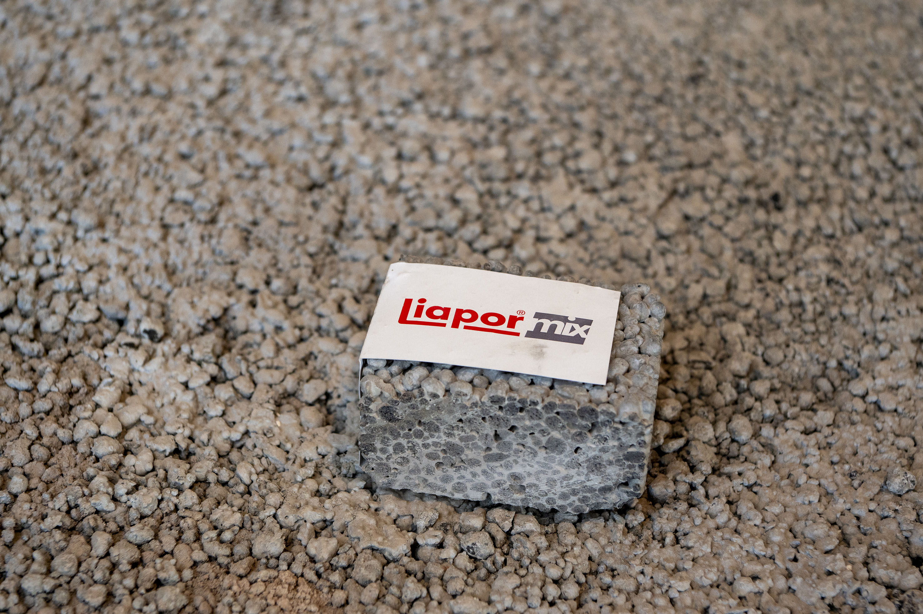 Patří se zmínit, že na trhu jsou tři betony řady Liapor Mix. Prvním z nich je Liapor Mix, který je nejhrubší, protože keramické kamenivo v něm obsažené má frakci 4-8 mm. Používá se jako výplňový tepelně-izolační beton na podlahy. A to byl náš případ domu v Ostrově. Objemová hmotnost je pouhých 800-900 kg/m3. Je vhodný také jako podklad pro podlahové vytápění, ne ovšem pro zalévání topného potrubí! Jeho zpracování je snadné a zvládnutelné i svépomocí. Je potřeba dodržet jen správný poměr směsi a vody a míchat zhruba 2–3 minuty. Minimální výška betonové vrstvy musí být alespoň 50 mm. V případě domu v Ostrově byla ovšem tato výška významně vyšší. Beton je pochozí za 24 hodin, ale celkově vysychá 5 až 7 dní.