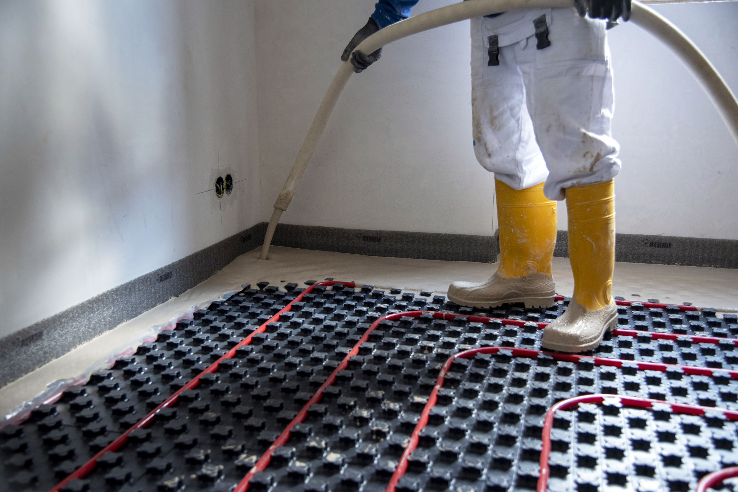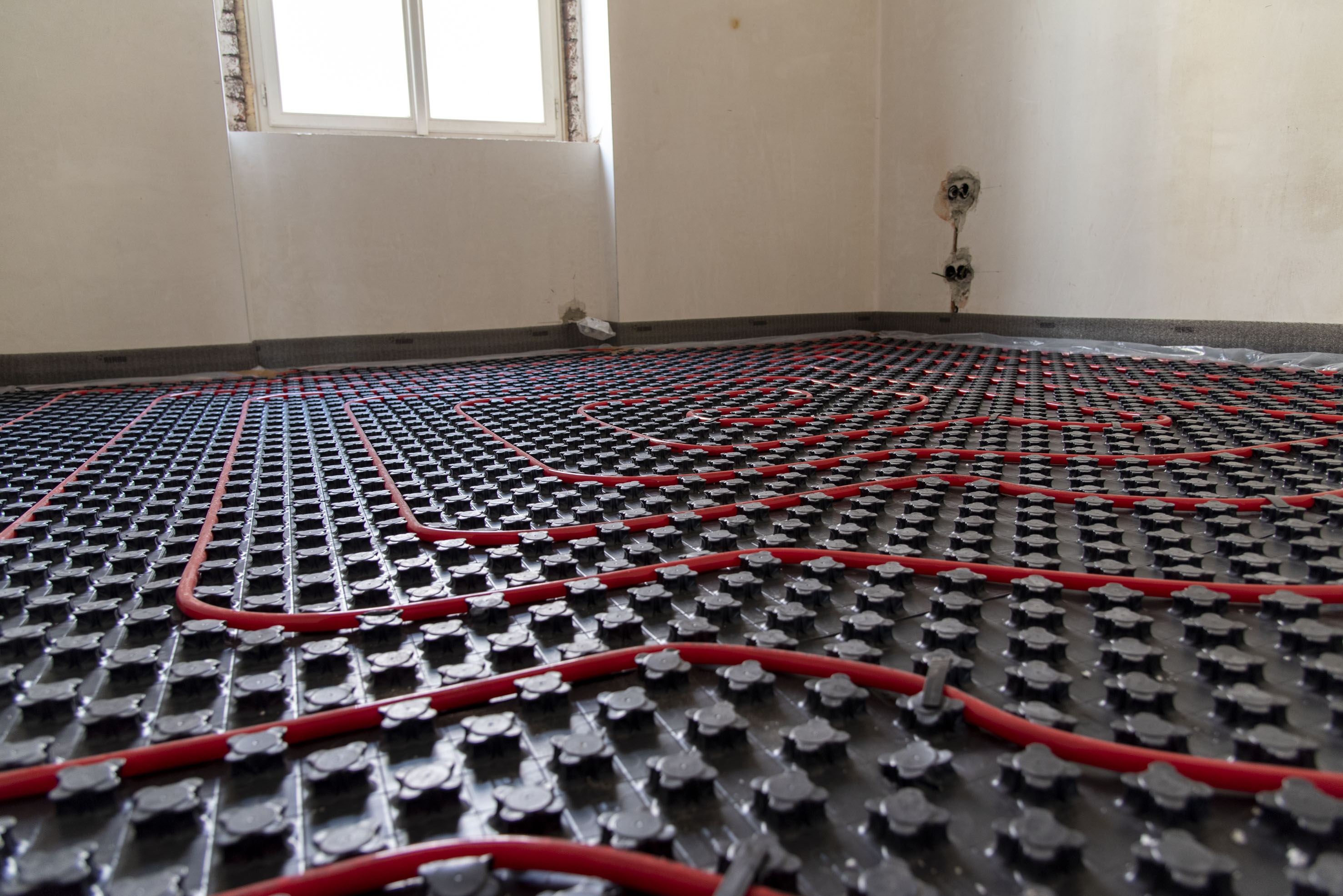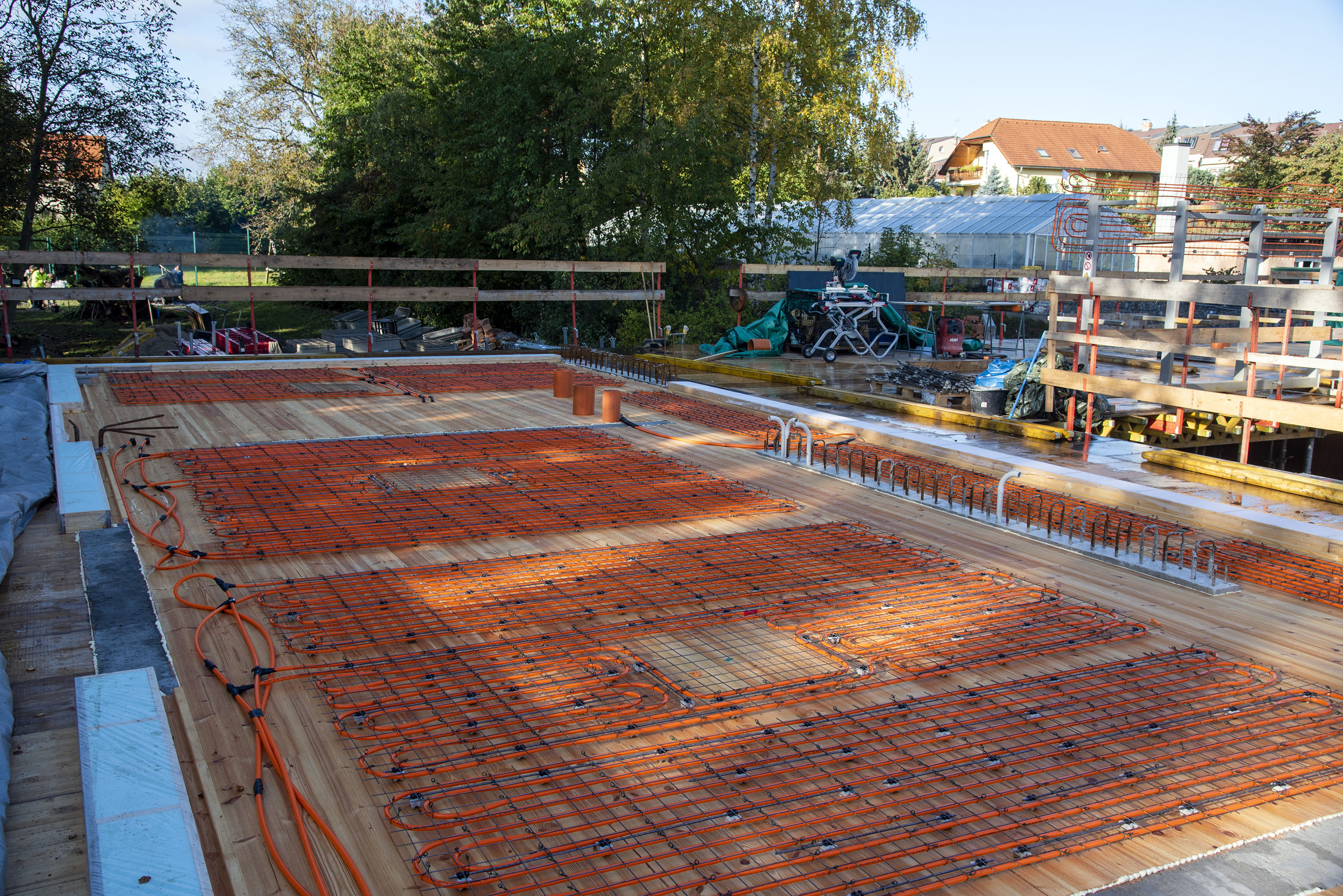 U varianty, kdy investor volí podlahové vytápění/chlazení, se často používají tzv. systémové desky (například REHAU Varionova), třeba i s kročejovou a tepelnou izolací, ve které je topné potrubí bezpečně zafixováno. I v tomto případě se jedná o mokrou cestu, neboť na systémovou desku s topným potrubím následuje litý samonivelační potěr na bázi cementu nebo síranu vápenatého (anhydrit). Ale jde to i suchou cestou, kdy investor dá přednost konstrukci suché podlahy (vyrovnávací podsyp + sádrokartonová/sádrovláknitá deska), což je výhodné u rekonstrukcí, nebo v horních patrech rodinného domu, případně u dřevostaveb.