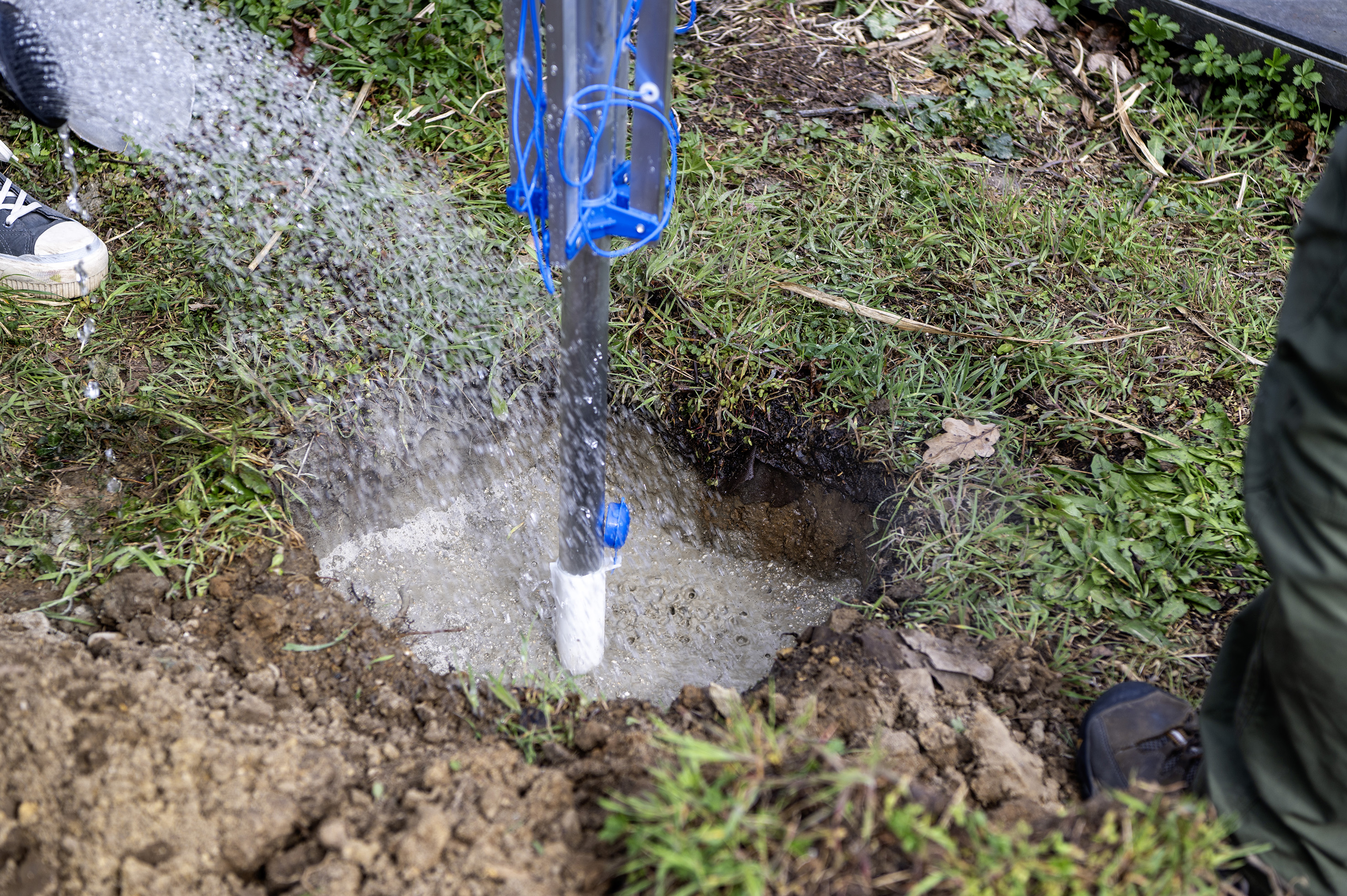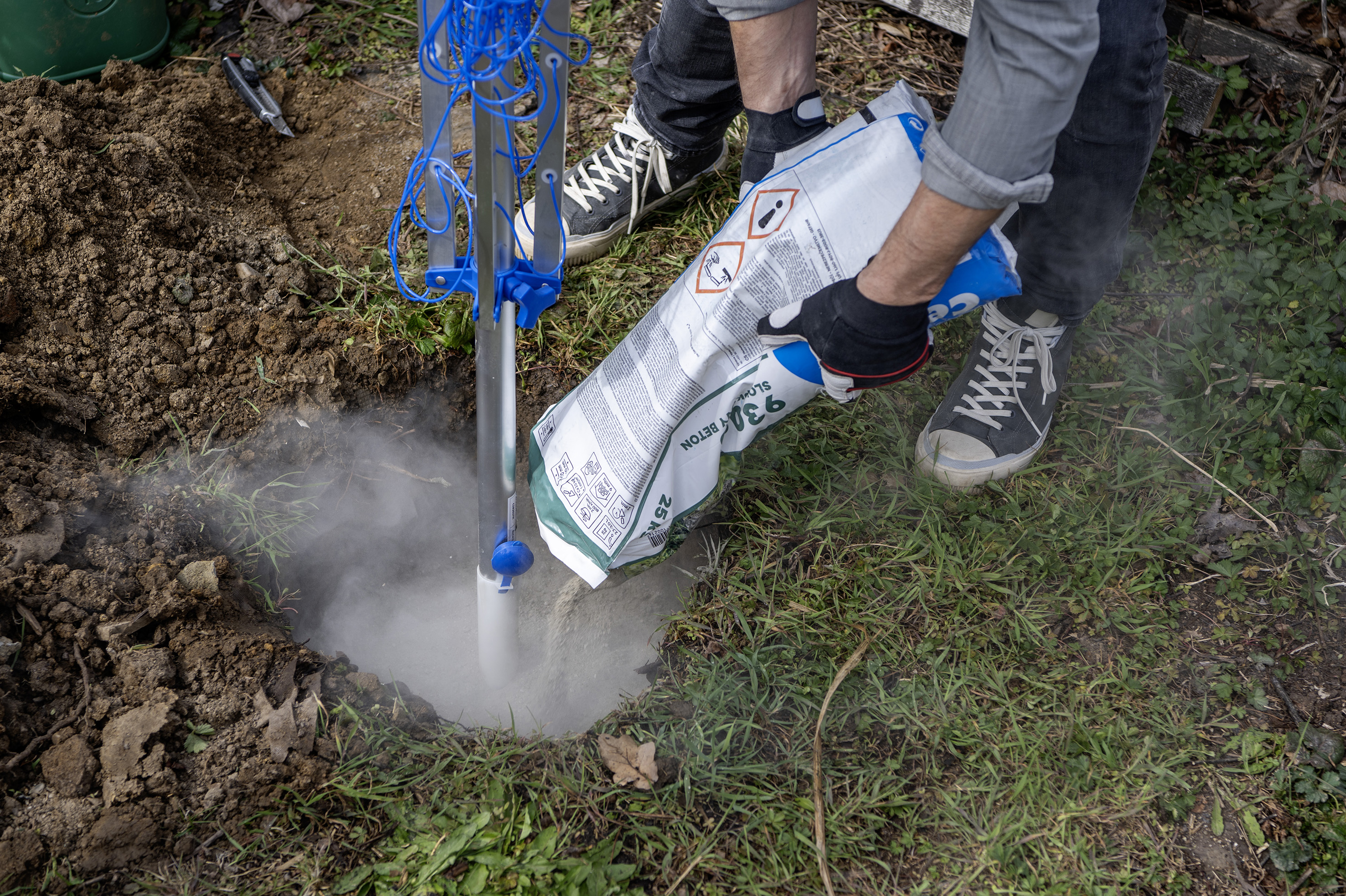 Vlastní betonování je velmi snadné a nepotřebuje žádné elektrické nářadí, to znamená ani míchačku nebo vrtačku s míchadlem. Zvládne jej proto úplně každý. Po vykopání díry se zem nejprve navlhčí a pak se nasype první 10cm vrstva betonové směsi, která vytvoří spodní podklad pro sloupek. Směs se zalije vodou v takovém množství, aby se voda tak akorát vsákla. Do 6 minut tato směs vytvrdne. Nyní se vloží do díry sloupek, který se zasype druhou 10cm vrstvou betonové směsi a opět se prolije vodou. Nechá se zatvrdnout. Tento postup se opakuje až je díra zacelená a sloupek perfektně drží. Poslední vrstvu je dobré udělat tak, aby měl beton finální tvar kužele nebo jehlanu, aby se na ní nedržela voda a trubka sloupku pak neměla tendenci rezavět. Doporučuje se tuto poslední vrstvu dobře vyhladit hladítkem. Nebo se poslední vrstva zasype zeminou v úrovni terénu. To už záleží na realizátorovi.