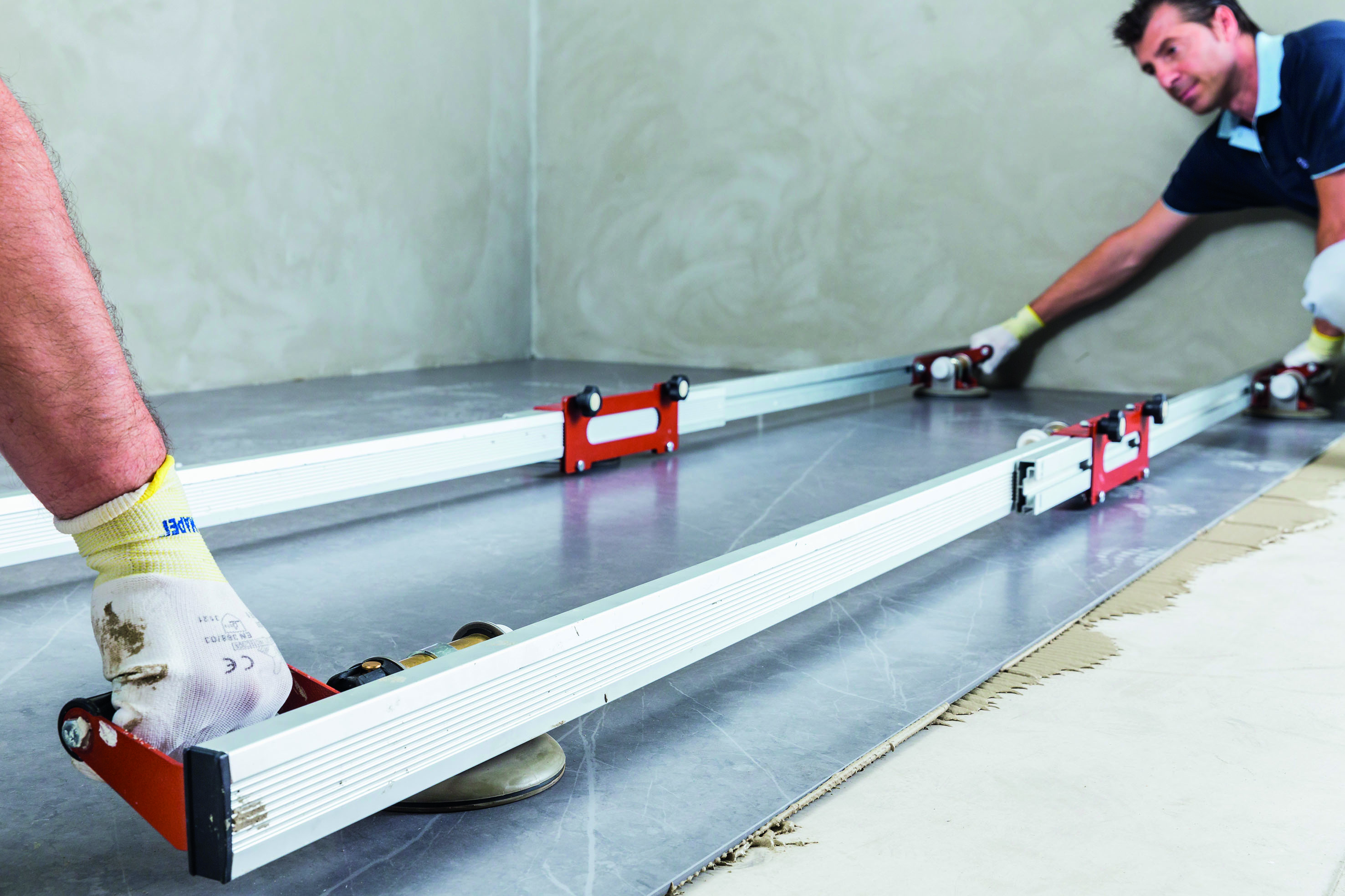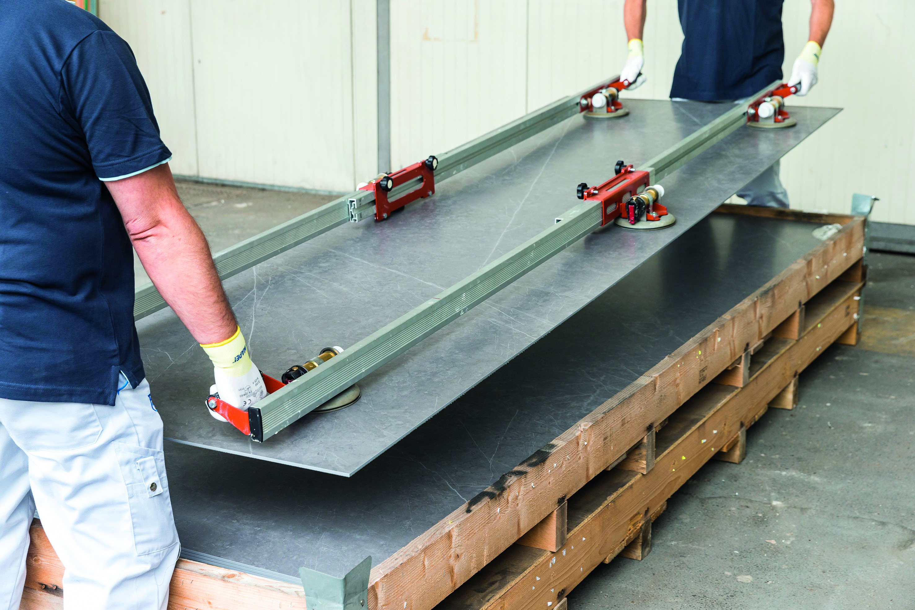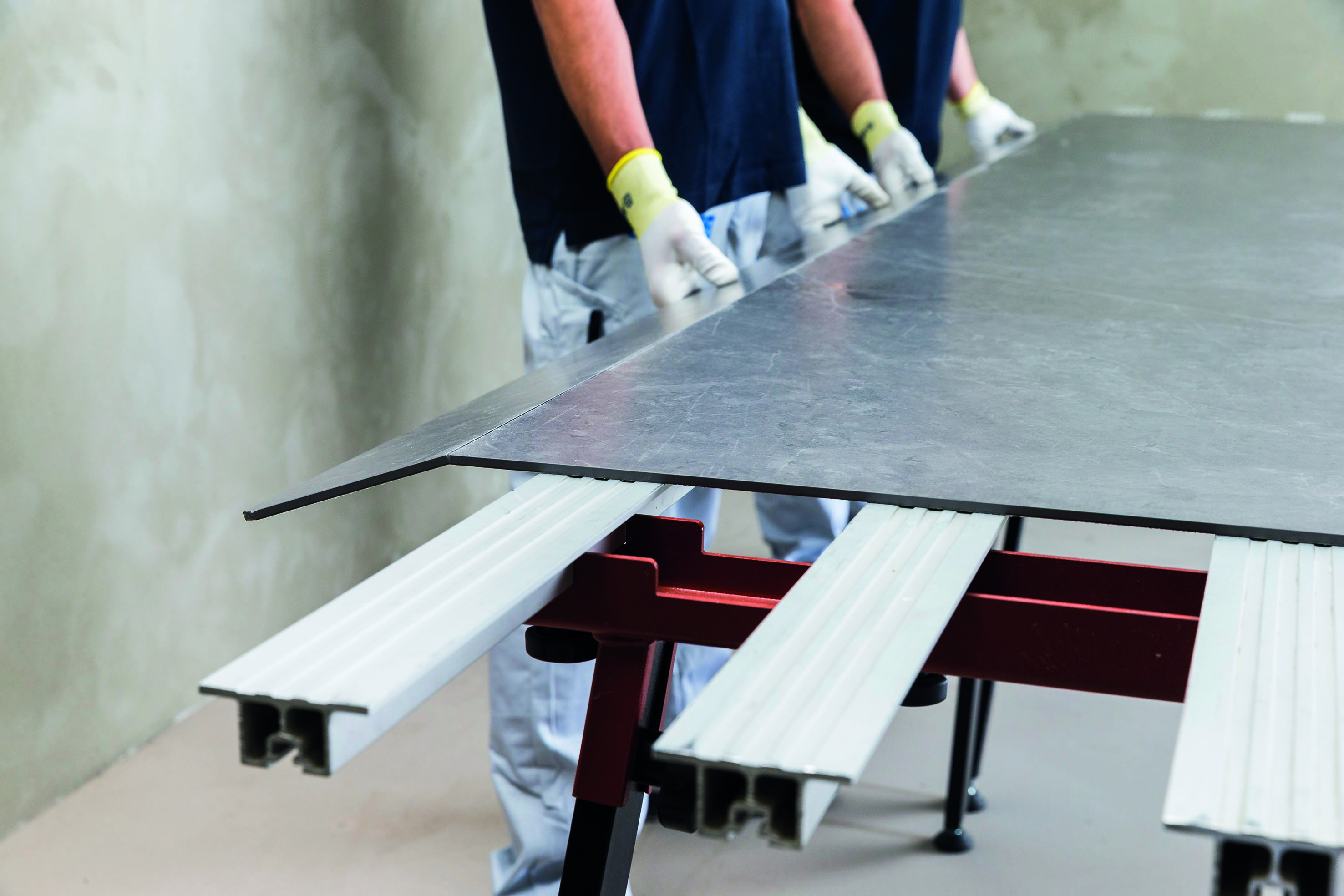 Je-li povrch podkladu kvalitně připravený, pak před lepením zbývá ještě zkontrolovat rubovou stranu obkladu, která může mít z výroby povlak – mastek – jenž vzniká při vypalování. Při lepení by se totiž namočil a „zmýdelnatěl“, což by vedlo k separaci lepidla s nepříjemnými následky. Řešením je obklad předem očistit – například prostředkem Ultracare Multicleaner. Při manipulaci tak velkých formátů, jako je například již zmíněný 160 x 320 cm, se používají vakuové přísavky nejmodernější generace. Přísavky mají displej a jsou tak chytré, že umožňují přesně nastavit, jak velká přídržnost je potřeba. Záleží na tom, jaký povrch obklad nebo dlažba má a jestli jej přenášíme svisle nebo naležato. Pomocníkem může být i speciální profesionální rám, ve kterém je obklad fixován, a který pomáhá jeho vyjmutí z přepravního boxu.