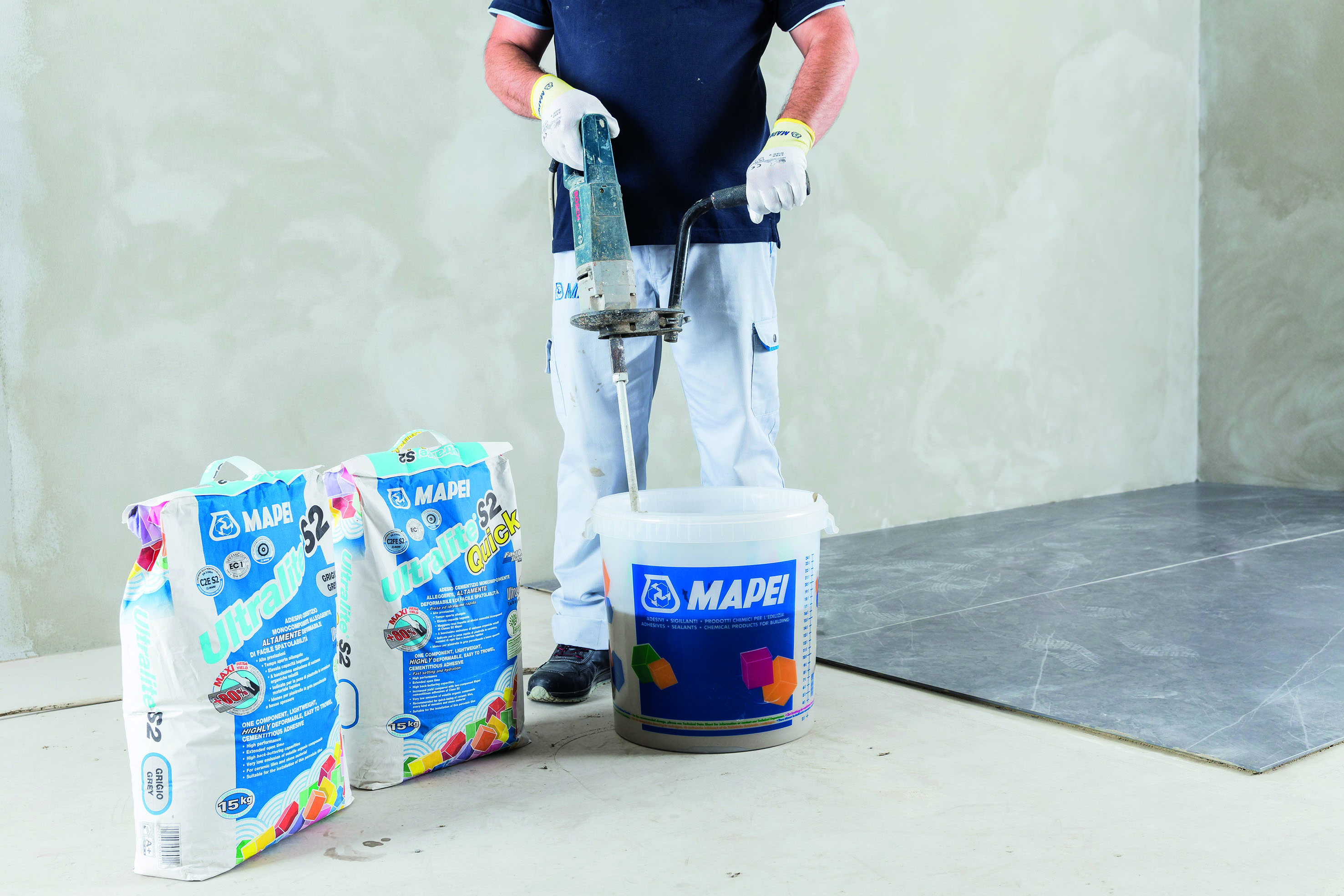 Pro vlastní lepení velkých obkladů je nesmírně důležité vybrat správné a kvalitní lepidlo. Mělo by to být lepidlo, které se vytvrzuje chemickým vázáním vody, protože jak jsme již zmínili, vlhkost je při lepení obkladů a dlažby problém. Při lepení velkého formátu potřebujeme, aby lepidlo vyzrálo i uprostřed dlažby. Lepidla jsou zařazována do dvou tříd podle příčné deformace (S1 respektive S2), ale také do několika tříd podle svého chemického složení (receptuře). Pro zajímavost: klasické základní lepidlo má prakticky nulový průhyb, zatímco vysoce deformovatelné lepidlo má průhyb 5 mm a deformovatelné od 2,5 do 5 mm. Je to vlastnost, která nám v podstatě definuje do jaké míry je dané lepidlo schopno eliminovat pnutí mezi roztažností podkladu a vlastního obkladu. Firma Mapei, která patří v tomto oboru na špičku, doporučuje u velkých formátů lepidlo ve třídách C2 S2. Výhodná jsou lehčená lepidla řady Ultralite, která se vyznačují nižší objemovou hmotností a krémovou konzistencí. Tato „krémovitost“ usnadňuje řemeslníkovi práci, protože lepidlo se výborně nanáší, drží dobře zub a otisk je na rubové straně dokonalejší a tím dochází k lepší přídržnosti. Snížená hmotnost usnadní samozřejmě i manipulaci. Lepidlo se nanáší metodou Buttering Floating, to znamená na podklad i rub obkladu. Co je však důležité – nanášet na obě plochy ve stejném směru. Dobrým pomocníkem je kvalitní ozubená stěrka. Na trhu je například stěrka se zkosenými zuby pod úhlem 45 °, nebo má jeden zub menší a druhý větší, který je odskočený. Nanášení lepidla je pak snazší. Ještě jedna poznámka k výběru lepidla. Velkoformátový obklad je drahý, zatímco stavební chemie stojí maximálně 10 % z ceny celé investice, proto je diskuze o tom, zda volit kvalitu nebo ne, úsměvná. Co lze jednoznačně doporučit: používat stavební chemii od stejného výrobce, pak má řemeslník výrazně větší záruku, že všechny komponenty budou mezi sebou správně fungovat. Výběr lepidla ovlivňuje také skutečnost jaký materiál se lepí a kde se lepí (například v exteriéru musí být vždy mrazuvzdorné lepidlo). Ostatně většina výrobců keramiky vždy u svého výrobku doporučuje druh lepidla na ten konkrétní obklad. A tímto doporučením je dobré se řídit. Při pokládce velkých formátů se používají nivelační systémy pro dorovnání. Jsou bud klínové nebo maticové. U klínových se do spáry vloží spona a pomocí klínu vloženého do spony se vzájemně vyrovnají sousedící dlaždice. Šířka spony se řídi podle toho jaká bude šířka spáry. Obkladači používají také tzv. maticový systém, u kterého je spona ve tvaru šroubu a řemeslník dotahuje šroubovou matici. Když lepidlo zatvrdne, obkladač zbytek spony/šroubu odstraní gumovou palicí.