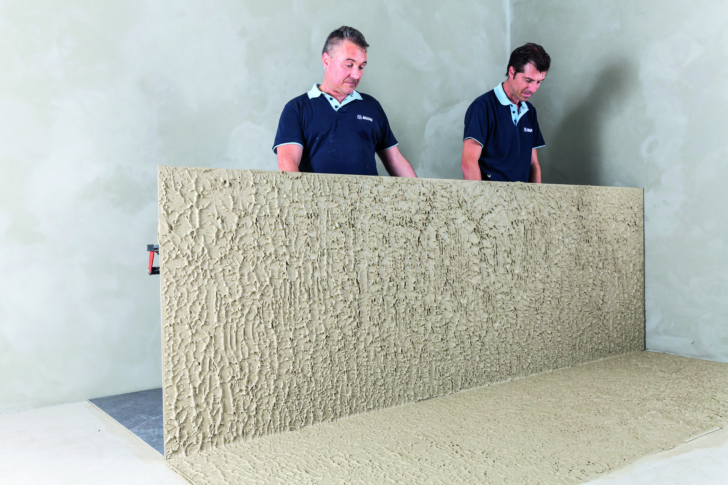 Před vlastním lepením velkoformátového obkladu je důležité náležitě připravit odpovídajícím způsobem podklad. Je-li cementový, věnujeme pozornost tomu, aby byl soudržný a stabilní. Pozor u anhydritového podkladu. Pokud bychom použili cementové lepidlo, pak je zapotřebí povrch pečlivě napenetrovat, neboť musíme chemicky oddělit „sádru“ od cementového lepidla. Kdybychom tak neučinili, hrozí riziko vzniku chemické reakce a posléze i k narušení spoje. Obecně platí, že největším problémem při lepení velkých formátů je zbytková vlhkost podkladu. Oříšek je v tom, že spáry bývají u velkoformátových obkladů velmi malé – zhruba pod 1 % plochy – a proto má vlhkost jen velmi omezenou možnost odvětrávat. Dříve měl obklad rozměr 30 x 30 cm a spára byla široká minimálně 3 mm. Ale dnes je tomu jinak. Jestliže by podklad nebyl perfektně vyzrálý a vyschlý, mohlo by dojít při následném vysychání a smršťování podkladu k vzniku mikrotrhlin. Zpočátku nejsou tyto mikrotrhliny vidět, ale později vedou k praskání střepu, který, jak již bylo zmíněno, je zejména u formátů XL a XXL velmi drahý a tudíž oprava problému nákladná. Důležitá je také dokonalá rovinatost, proto se u velkých formátů povrch podkladu srovnává velmi jemnou samonivelační stěrkou. Anhydritový podklad musíme prakticky vždy přebrousit tak, až jsou vidět zrna pojiva, abychom měli jistotu, že povrch bude splňovat všechna uvedená kritéria.