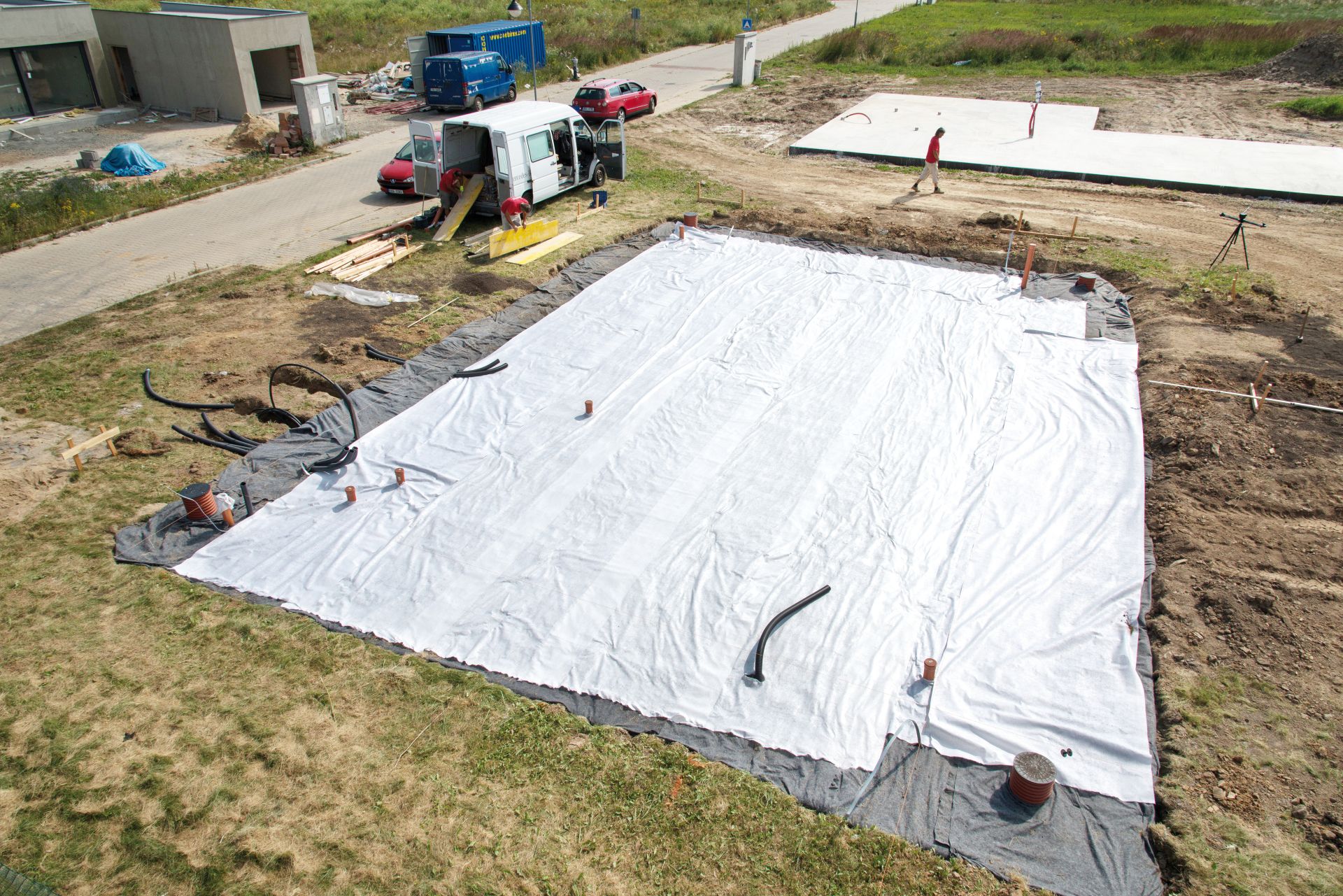 Pokud chceme dům podsklepit, logicky je nutné izolovat celou spodní stavbu – tady existuje řešení hned několik, ale tomu se budeme věnovat zase někdy příště. Ve své podstatě jde o nutnost izolace stěn a podlahy podzemního prostoru proti tlakové podzemní vodě – to se nejčastěji realizuje pomocí asfaltových pásů, hydroizolačních plastových fólií nebo izolačních stěrek, které se nanášejí pomocí špachtle (pozor ale na dokonalost provedení – nesmí se vynechat ani milimetr). Takto ošetřené stěny jsou pak dále zatepleny lepenými nebo kotvenými deskami extrudovaného polystyrenu, ten je chráněn drenážní nopovanou fólií a vrstvou netkané textilie.