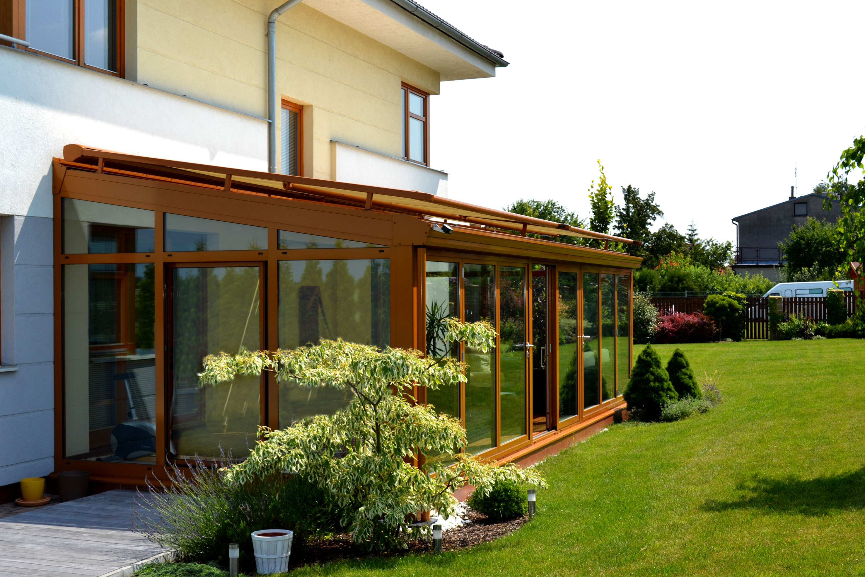 Jaký zvolit materiál? Na výběr jsou, podobně jako u okenních profilů, také plastové systémy, ale čím dál více se v dnešní době prosazuje hliník, který má mnoho výhod. Předně umožňuje vyrobit subtilnější konstrukci, která je ve srovnání s plastem pevnější, takže dovoluje navrhovat větší formáty. Hliníkové komponenty jsou také tvarově stabilnější v extrémních podmínkách. Design zimní zahrady se stává výkladní skříní domu. Pokud ale potřebujeme ušetřit, lze navrhnout z hliníku pouze nosnou konstrukci včetně střechy a nenosné části se mohou doplnit plastovými prvky. Tradičním výrobcem hliníkových konstrukcí je německá firma SCHÜCO, která nabízí nepřeberné množství systémových komponentů a konstrukčních uzlů, které umí vyřešit všechny náročné a složité detaily, důležité pro správnou funkci. Je to otázka dlouholetých zkušeností a mnoha referencí. Pokud k tomu přidáme širokou škálu skel včetně speciální povrchové úpravy omezující výrazně solární zisky, pak máme jistotu, že bude zimní zahrada dlouho a spolehlivě sloužit. Protože se nejedná o malou investici, je dobré vše pečlivě zvážit předem. Pomoci může například velmi jednoduchý konfigurátor zimních zahrad, který je přístupný na webových stránkách firmy DAFE-PLAST, která zimní zahrady nabízí jak z hliníkových, tak z plastových profilů. Jednoduše krok za krokem si volíme tvar, materiály, barvu a příslušenství, abychom nakonec získali orientační rozpočet. Je to jako s autem, čím více komfortu chceme, tím musíme sáhnout hlouběji do kapsy.