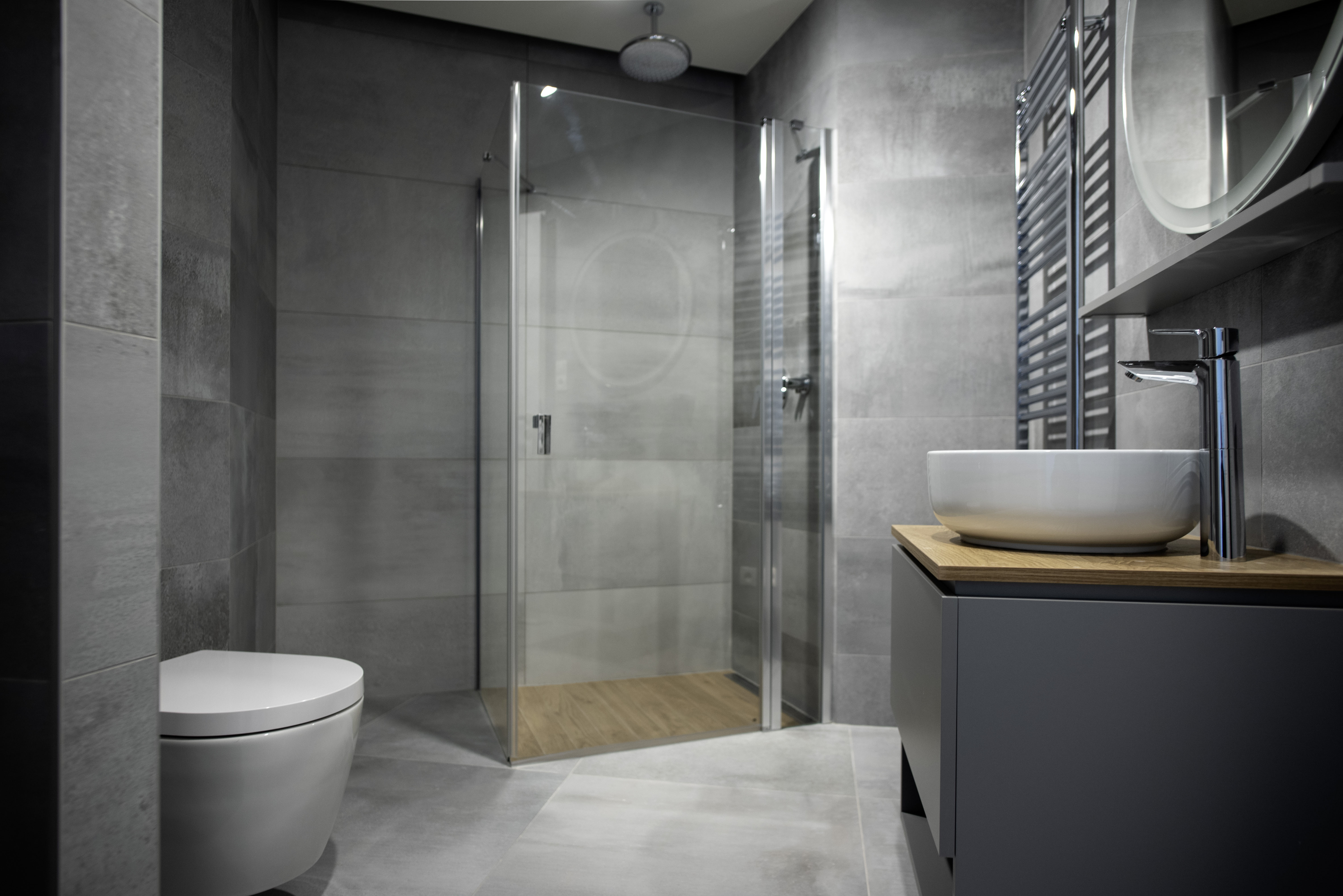 Šedé schéma – v souladu s obecným posunem v interiérech od studených barevných schémat k teplým se šedé aplikace v koupelnách, vyjma strukturovaných imitací betonu, jeví jako zastaralé.