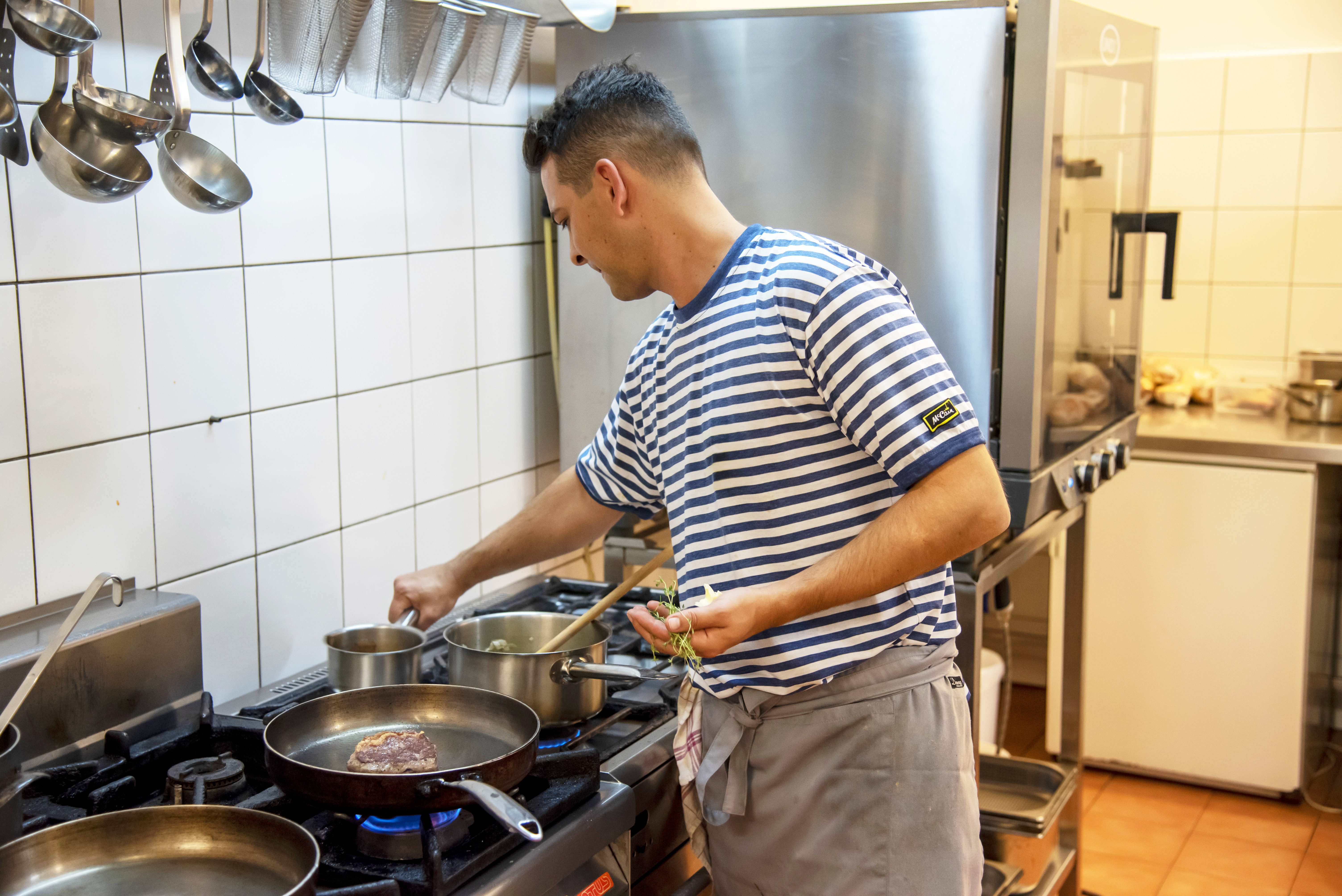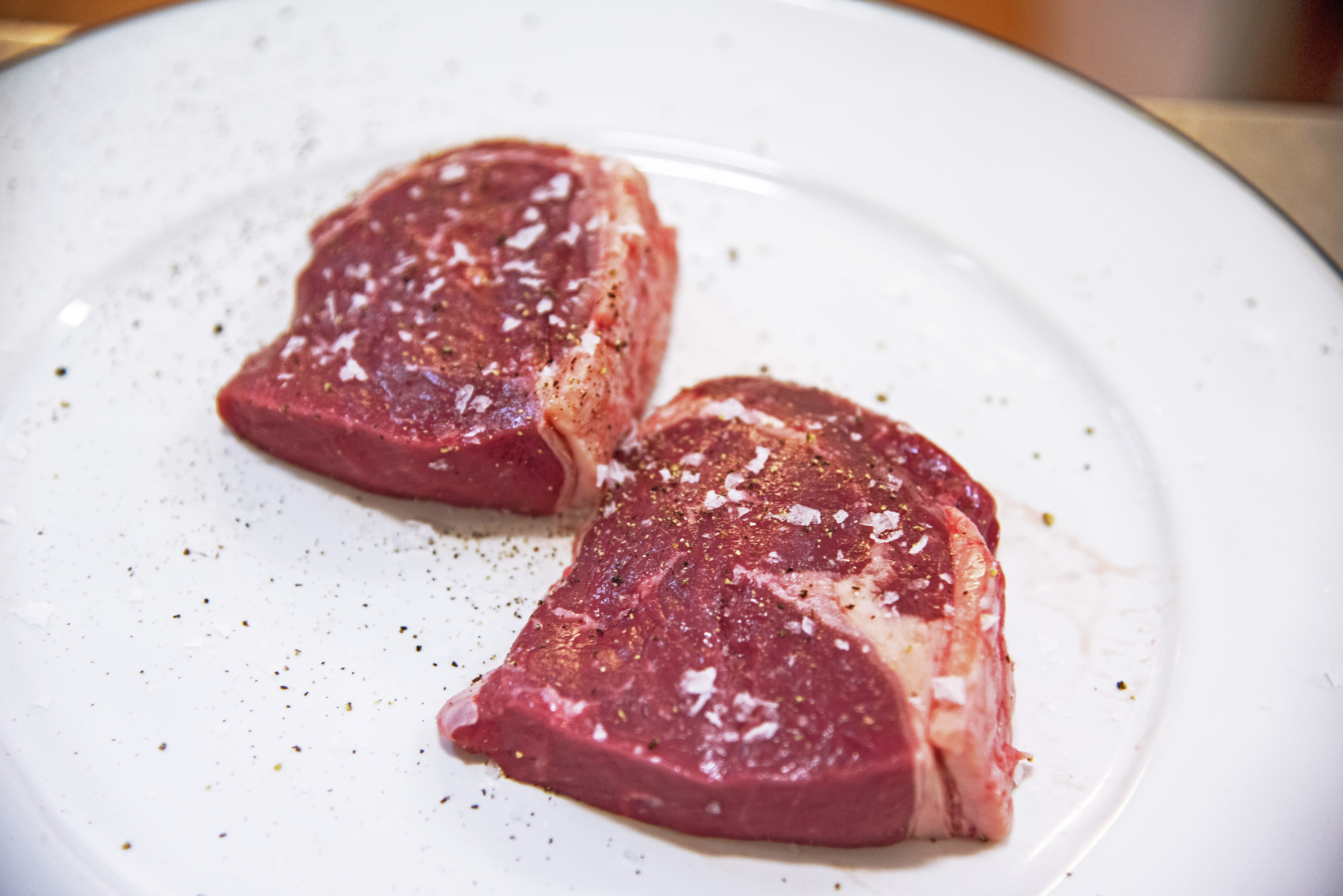 Připravit perfektní steak chce trochu cviku. V principu potřebujete dosáhnout určité vnitřní teploty, například u stupně propečení medium rare by měla být 55 °C. U klasického stupně medium 61 °C a medium well 64–65 °C. Velmi důležité je nechat steak po grilování odpočinout nejlépe 7–10 minut. Řada kuchařů tvrdí, že solit a pepřit se má až po grilování. Ne tak Lukáš Nevyjel. „Mě to přijde nelogické, vždyť i do omáček dáváte pepř a sůl, aby se v ní uvolnila chuť. Takže solím a pepřím zásadně předtím, než steak hodím na pánev.“ V další fázi našeho povídání byly všechny smysly obdařeny osobitým gastronomickým zážitkem. Šéfkuchař se chopil pánve a začal vařit. Jsou vlastně čtyři cesty, jak dosáhnout cíle. Jednou z cest je hodně rozpálená pánev, na kterou položíte opepřený a osolený steak potřený trochou oleje. Opečeme na jedné i druhé straně. Zhruba 3 minuty. Přidáme trochu másla i oleje, aby se to nepřipálilo, snítek rozmarýnu, česnek a maso na závěr glazujeme. Druhá cesta je méně rozpálená pánev a delší čas pro grilování a více oleje. Maso je pak křehčí, ale nesmí se dusit.