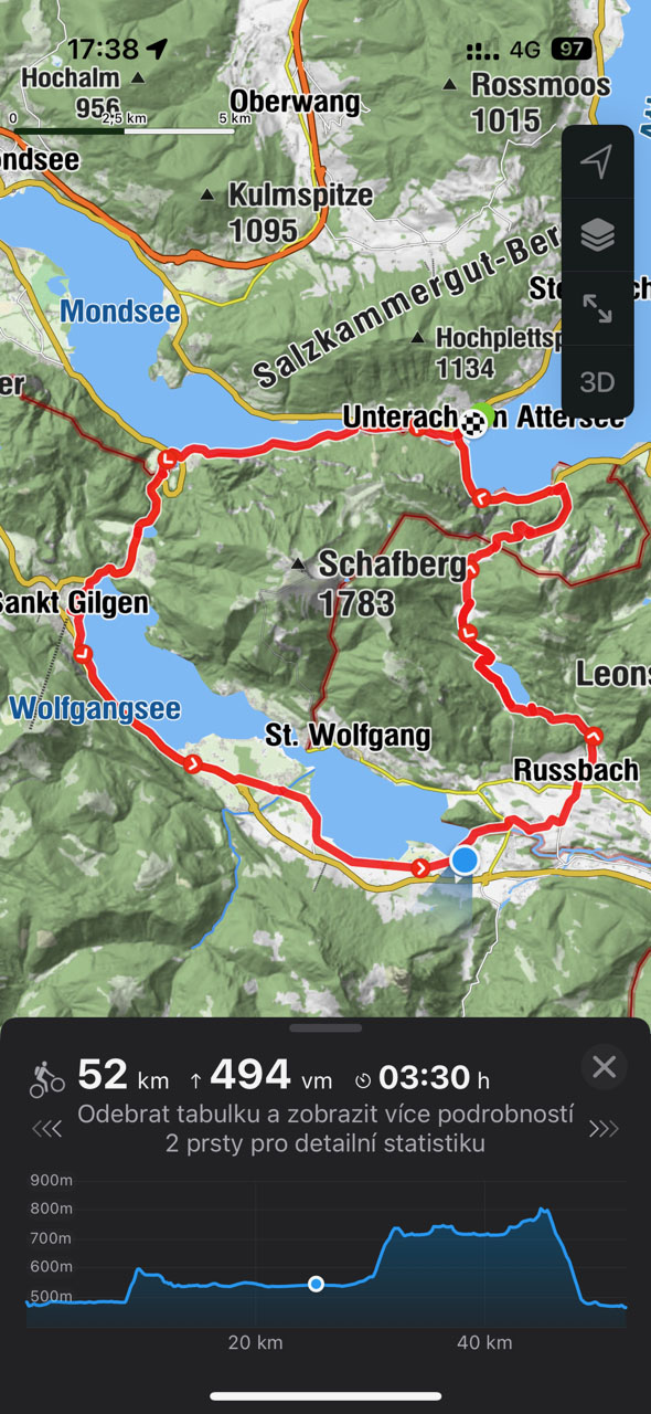 My jsme si vybrali 60kilometrový okruh vedoucí kolem čtyř jezer, který nabízel rozmanitost zážitků. Cesta ze Stroblu do Sankt Gilgen vede podél břehu jezera, tedy pouze po rovině. V lázeňském městečku může být čas na dopolední kávu. Trasa posléze začne stoupat k malému jezírku Krotensee. Je tu malé parkoviště kde si ve stánku můžete zakoupit uzeného pstruha. Po chvíli odbočíte ze silnice a lesní cestou sjedete k jezeru Mondsee. Svému názvu vděčí díky tvaru protáhlého měsíce a jeho dominantou je Dračí stěna, na kterou vede ferrata. Pak už se vydáte opět podél břehu k dalšímu jezeru, kterým je Atterse. Nejdříve však můžete velmi dobře poobědvat v Gasthof See, které se nachází za můstkem na konci jezera Mondsee. Městečko Unterach am Attersee je poklidné, ale příjemné a stojí za prohlídku. Další cesta vede opět podél jezera až na odbočku k jezeru Schwarzensee. Tady začne několikakilometrová nirvána. Strmé stoupání s řadou utažených zatáček je pouze pro trénované anebo pro ty, kdo si půjčili elektrokolo. Ale výjezd stojí za to. Nahoře jsou již příjemné terény, krásná panoramata a samozřejmě jezero Schwarzensee. Prudkým sjezdem dolů se dostanete na odbočkou do St. Wolfgangsee, kam stojí za to zajet třeba na zmrzlinu. No a pak už nezbývá než se vrátit zpátky do Stroblu. Když budete mít pěkné počasí, trasu si užijete po všech stránkách a na převýšení 500 metrů budete dlouho vzpomínat.