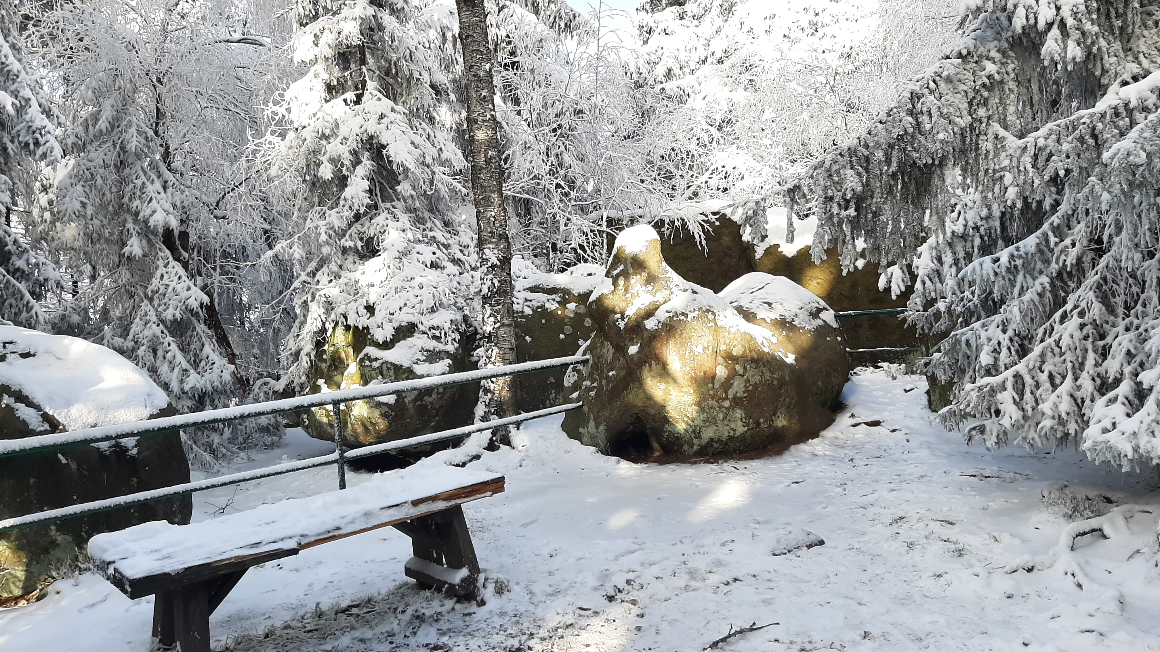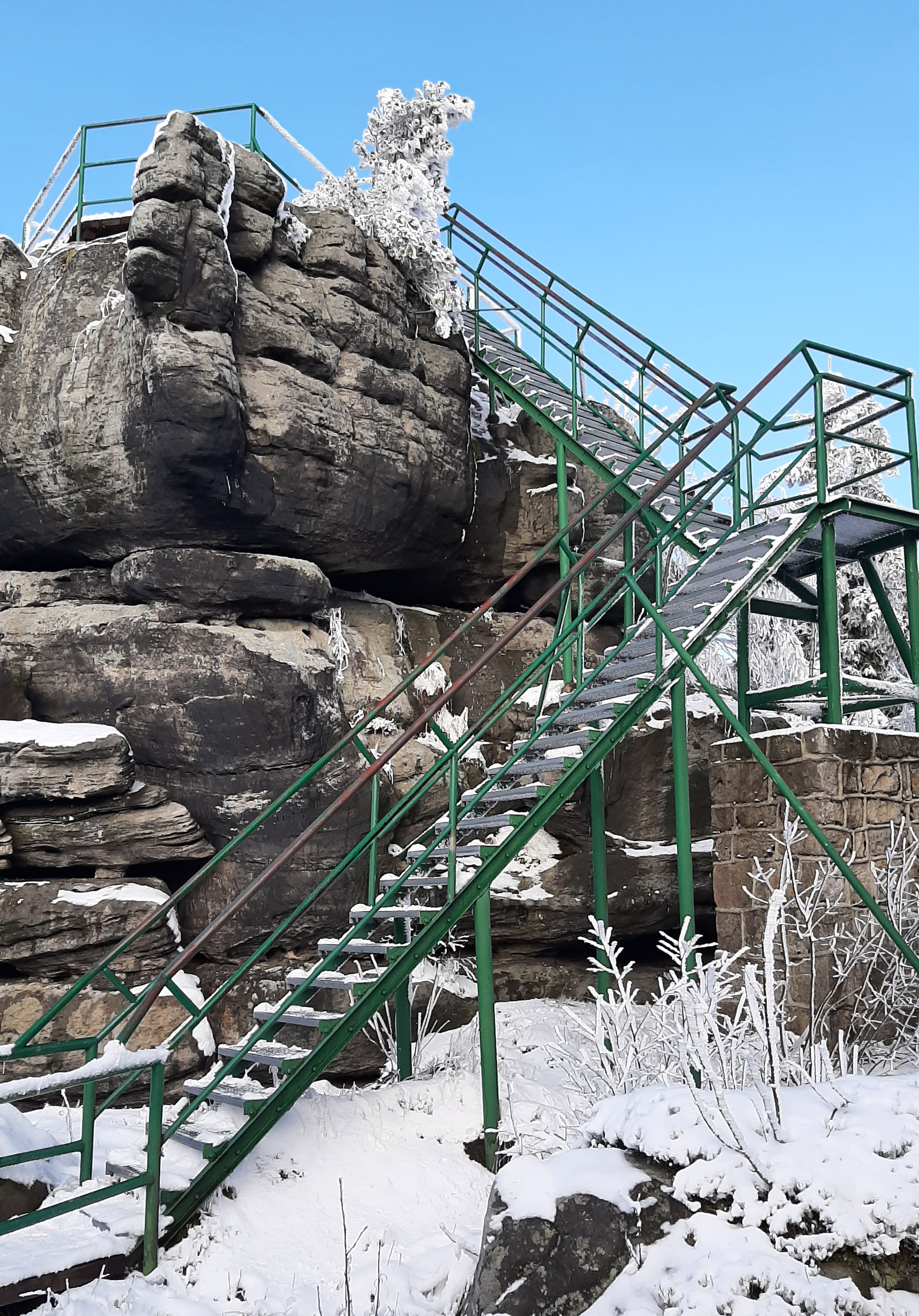 Za restaurací je zpoplatněný vstup do samotného skalního města. Do každého ze skalních měst je to 7 Zl, pokud nemáte polskou hotovost leze platit kartou – my jsme v zimně neplatili vůbec. Turistická trasa střídavě klesá a stoupá po skalním schodišti, procházíte opět po udržovaných dřevěných chodníčkách úzkými štěrbinami, bránami, kde je nutné se snížit. Na okruhu postupně procházíte kolem nebo přes skalní útvary: Trůn, Kachňata, Krakonoše, Lidoop, Velbloud, Ďáblova kuchyně, Kolébka, Koňská hlava, Kolébka a Slon. Sestoupáte dokonce do Pekla, které patří k nejúchvatnější části skalního bludiště. Stezka vás zavede do ohromujících, hlubokých a temných skalních rozsedlin. Po průchodu skalním městem se ocitnete na 2 vyhlídkách, ze kterých mimo jiné hezky vidíte na obec Karłów. Od nich budete klesat po schodech na výchozí místo okruhu. Pokud sebou máte děti je zde možné navštívit i Dinopark, nebo ochutnat místní sýry, či zakoupit suvenýry ve stáncích které lemují přístupovou cestu.